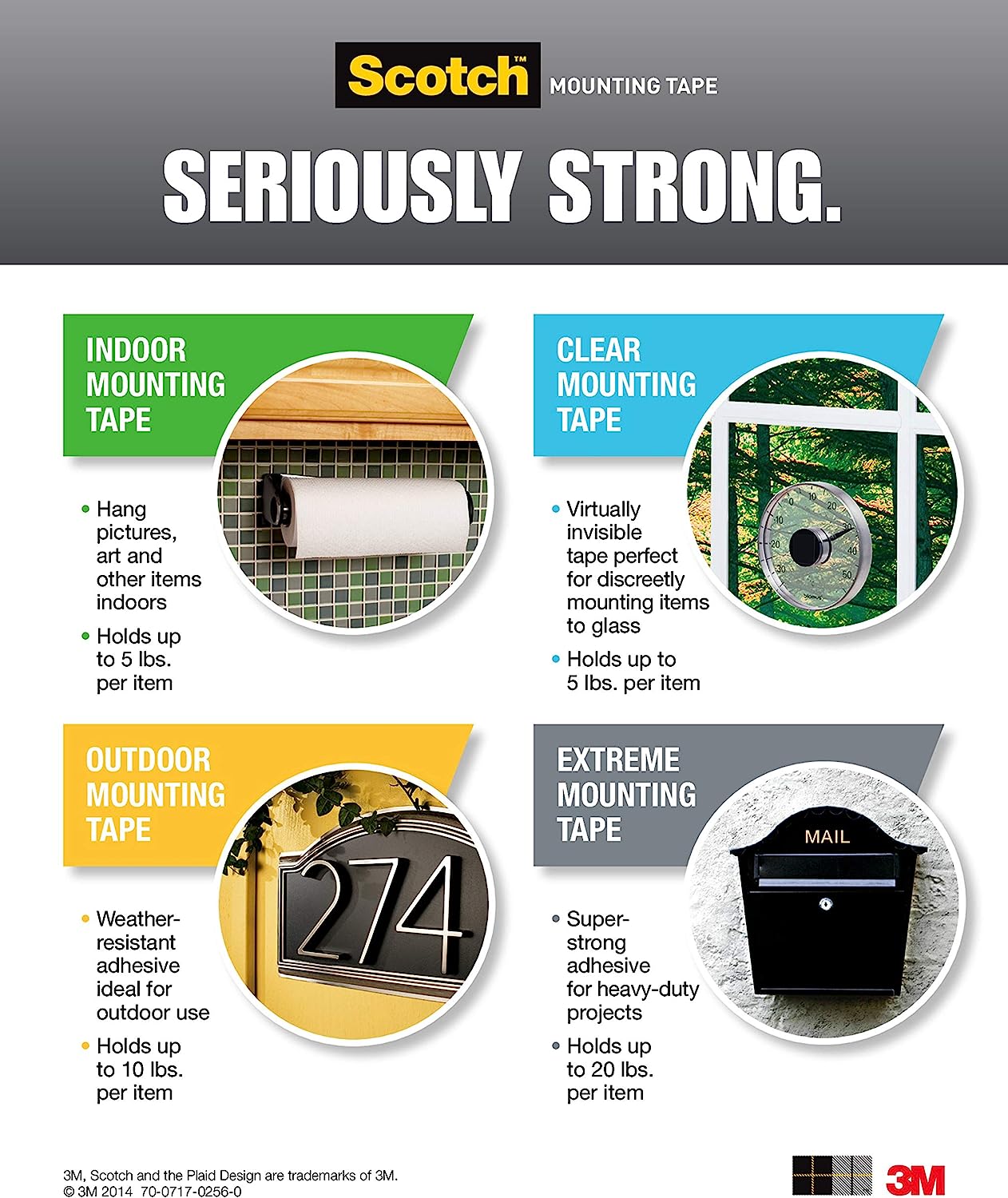 This professional-quality tape is designed for attaching items up to 5 pounds to virtually any smooth surface. It is weather-resistant and holds securely even on rough outdoor surfaces such as brick or stucco.