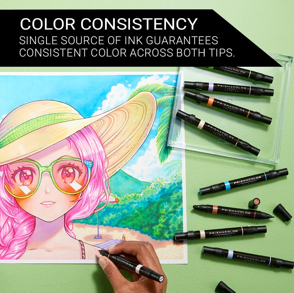 Lay down precisely the marks you want to make in 12 Manga-perfect colors with Prismacolor Premier Double-Ended Art Markers. The dual-ended design features a fine tip on one end and a large chisel on the other. This allows you to quickly flip between precision and coverage. The ink is richly saturated and designed for an effortlessly smooth flow while a single source of ink ensures color consistency at both ends. And the advanced, alcohol-based pigment resists fading so your creations will endure.