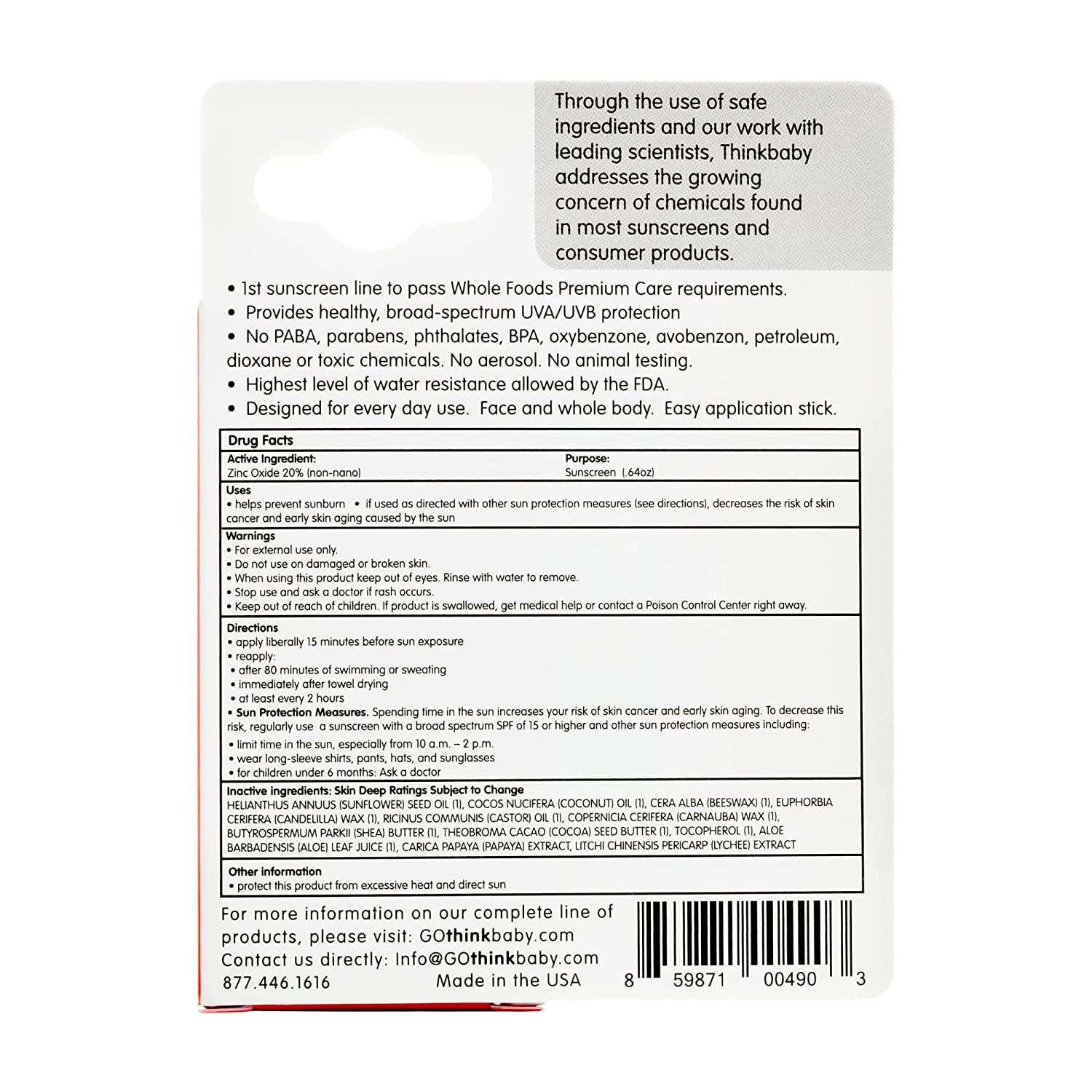 CLEAN MINERAL FORMULA: The first sunscreen to pass Whole Foods Premium Care requirements, Thinkbaby vegan, Leaping Bunny certified sun creams contain no PABA, parabens, phthalates, BPA, oxybenzone, avobenzone, petroleum, gluten, dairy, or toxic chemicals.
