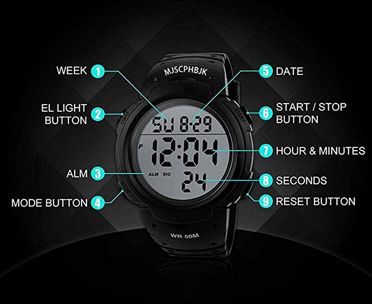 Thickened case to protect its internal parts. Anti-drop and not easy to be worn-out. Square concavesymmetry design, with the overall black color matching, it is of very cool sports style and personality.Specification:Dial Color: Black DialCase Diameter: 1.9 inch / 4.7 cmDial Case Thickness: 0.5 inch / 1.2 cmBand Color: BlackBand width: 0.8 / 2.1 cmBand Length: 9.8 inch / 25 cm(Suitable for 6.7-8.5 inch in circumference wrists to wear)Band Clasp Type: BuckleWatch Weight: 2.4 oz / 68 gBattery Code: CR2025Screw locked back cover, highly waterproof, easy to replace the battery.164FT 50M WATERPROOF, SWIM, SHOWER, NO PROBLEM! DESIGN for SPORT. 50M 5ATM water resistant.NOTE: please DO NOT press any buttons in the water. Military 24H time mode and imported EL back light functions make it perfect for all kind of sport and daily use.Material: Case Material: Silicon Rubber, Plastic Band Material: Silicon Rubber Mirror Surface: Mineral Glass MirrorErgonomic recess and rattlesnake tail-like texture with square hole band design. While accelerating perspiration,it is of strong three-dimensional sense. Loops also consolidate stability of the strapLarge numbers on the dial and with EL Backlight, easy to read, suitable for viewing in dark environment, very convenient.Multi-functional buttons, simple structure, easy to operate.High quality material makes it lightweight and comfortable to wear.