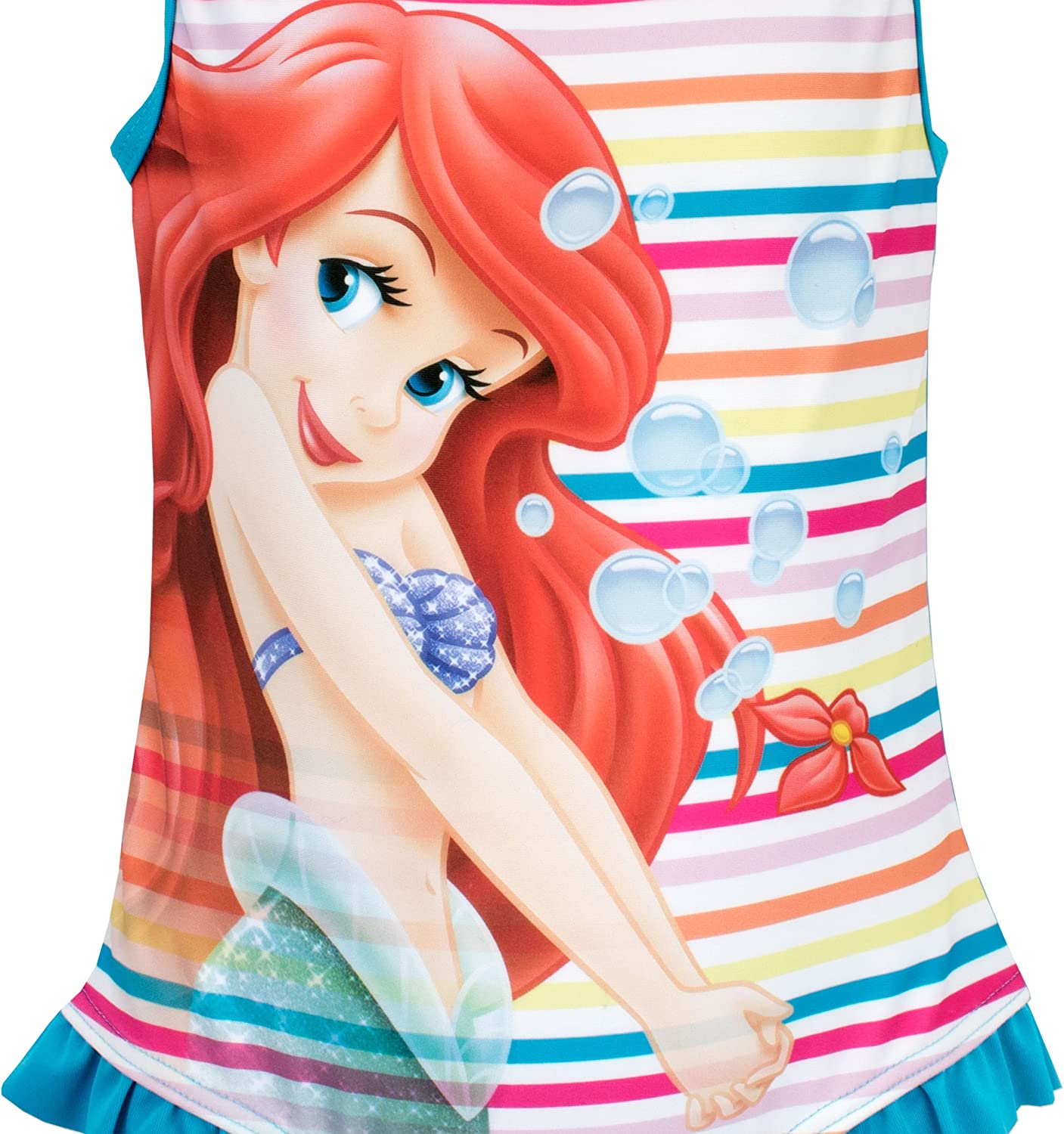 Girls Disney Little Mermaid Swimsuit. This cute Ariel bathing suit comes with a bold stripe print in the background, spaghetti straps and a frill at the bottom for extra cuteness. Your princess will be ready to splish and splash in the pool or by the sea.