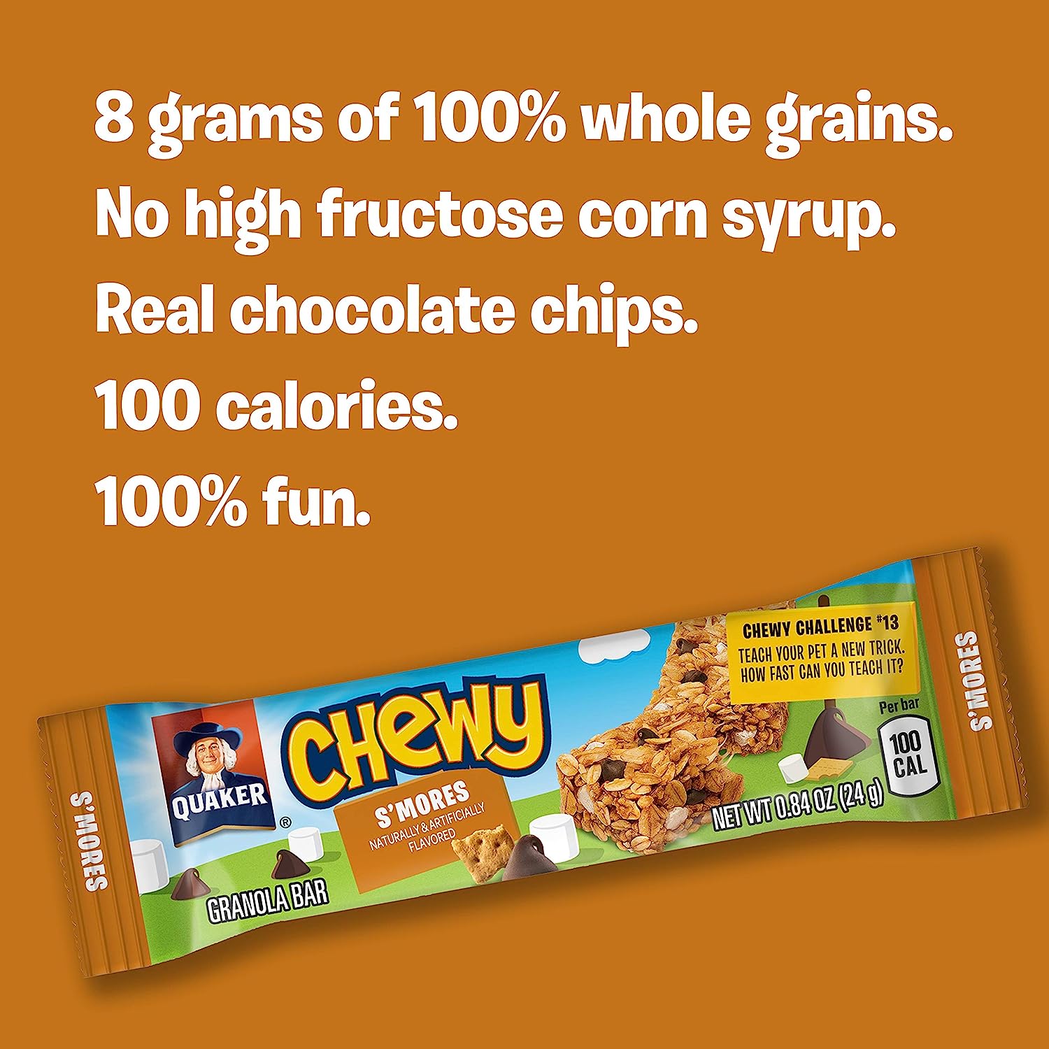 About this item Includes 58 individually wrapped granola bars you can enjoy at home, at school, or on the go Features 12 chocolate chip, 12 peanut butter chocolate chip, and 10 s'mores flavor Chewy granola bars, plus 12 chocolate chip and 12 peanut butter flavor Chewy Dipps chocolate covered granola bars Made with real rich chocolate, indulgent peanut butter-flavored chips, and toasted granola Packed with 8 grams of 100% whole grains per bar. No high-fructose corn syrup At only 150 calories or less per bar, Quaker Chewy and Dipps bars are a perfect snack for any occasion