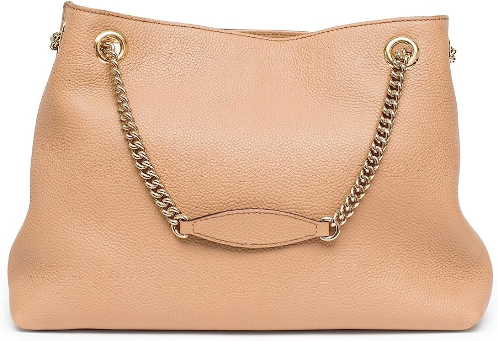 Detachable Leather Tassel. Double Chain Shoulder Straps with Shoulder Pad. Inside Hook Closure. Gold-Toned Hardware.