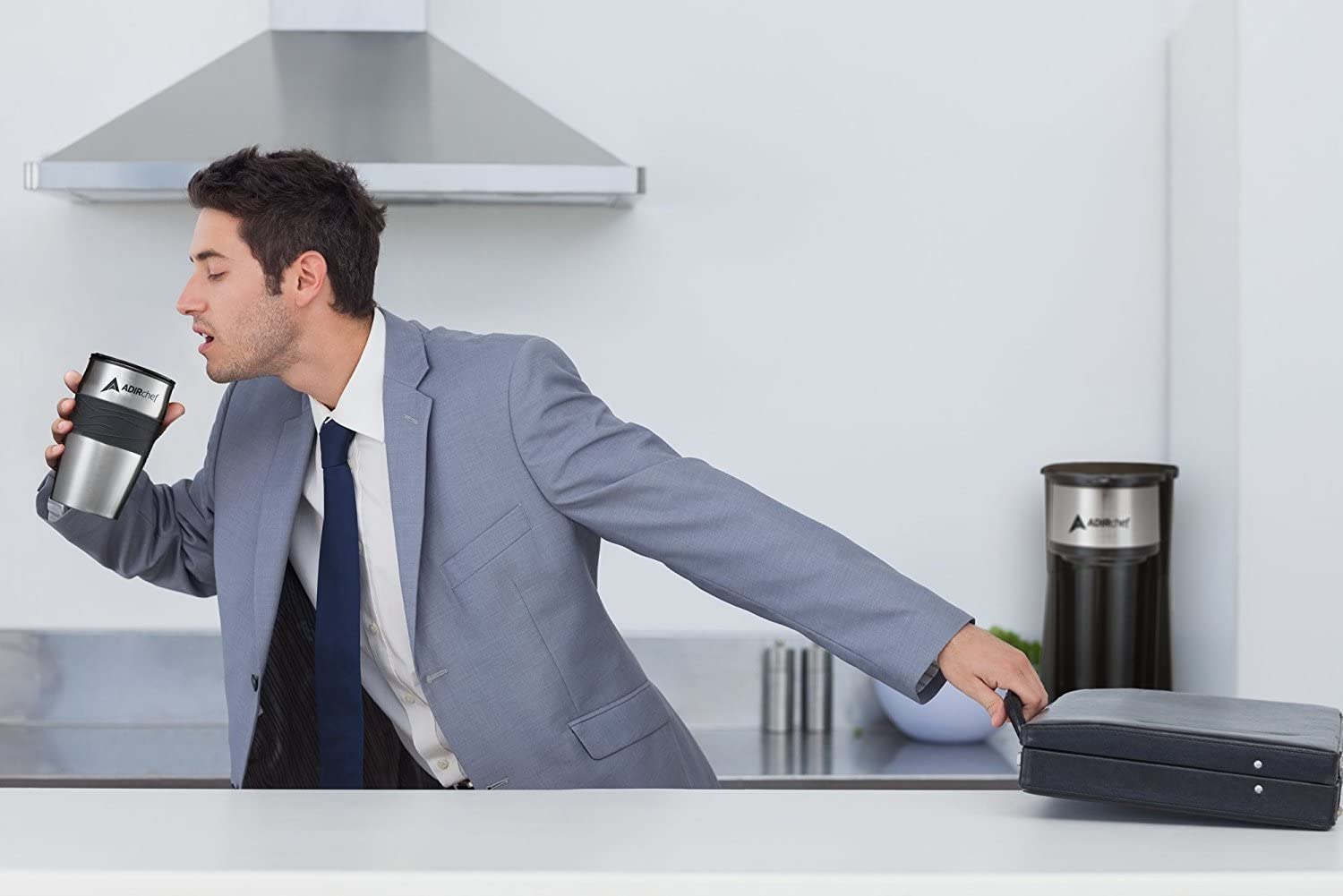 PORTABLE APPLIANCE. Small and lightweight, this unit is the perfect size for tight counter spaces or tiny cubicles in the workplace and can be easily transported from one location to the next. In addition, the mug is equipped with a comfort grip Band and is tapered to fit most vehicle cup holders. If you prefer to set up the appliance in your kitchen permanently, you can just grab the mug and take your coffee to go. It is also a great father's day gift.