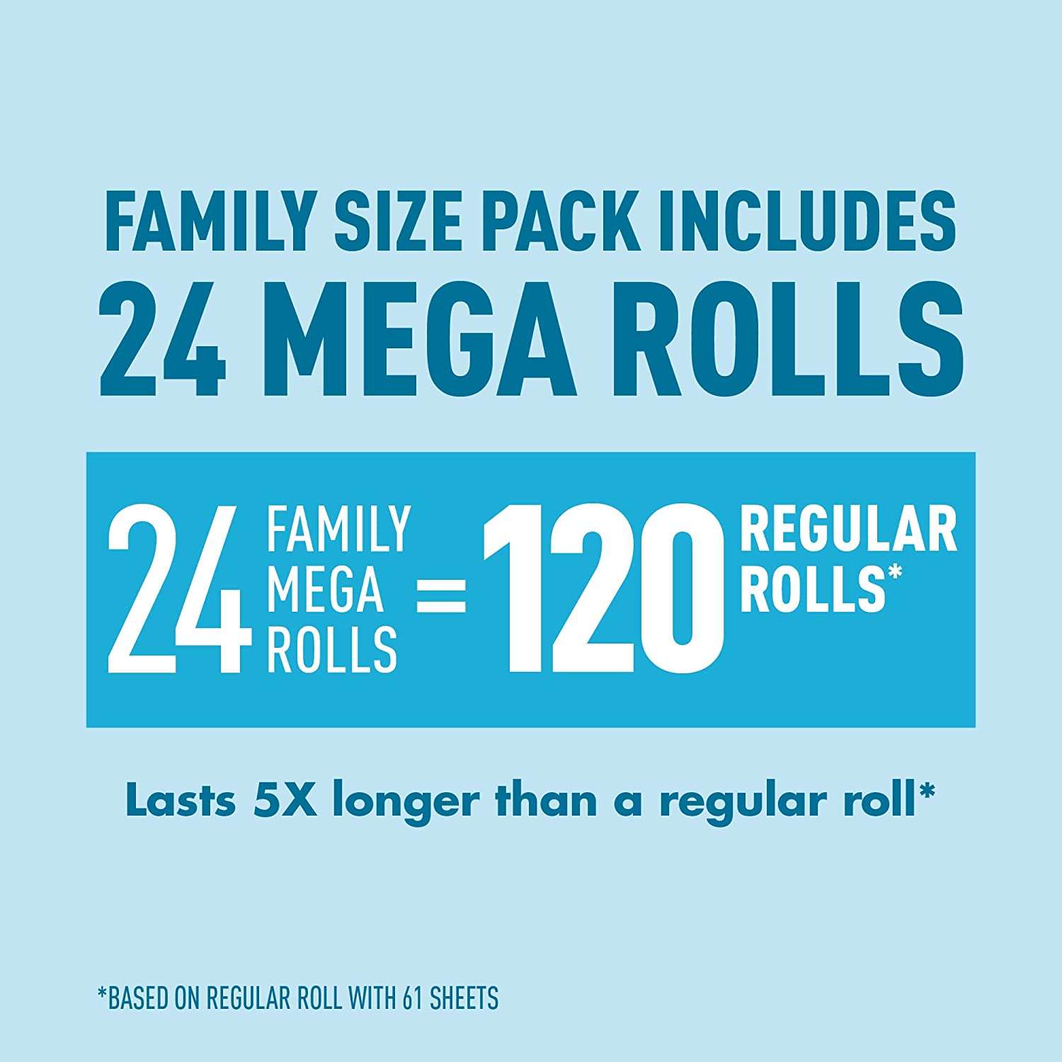 • 24 Mega Rolls = 120 Regular Rolls (based on a regular roll with 66 sheets)