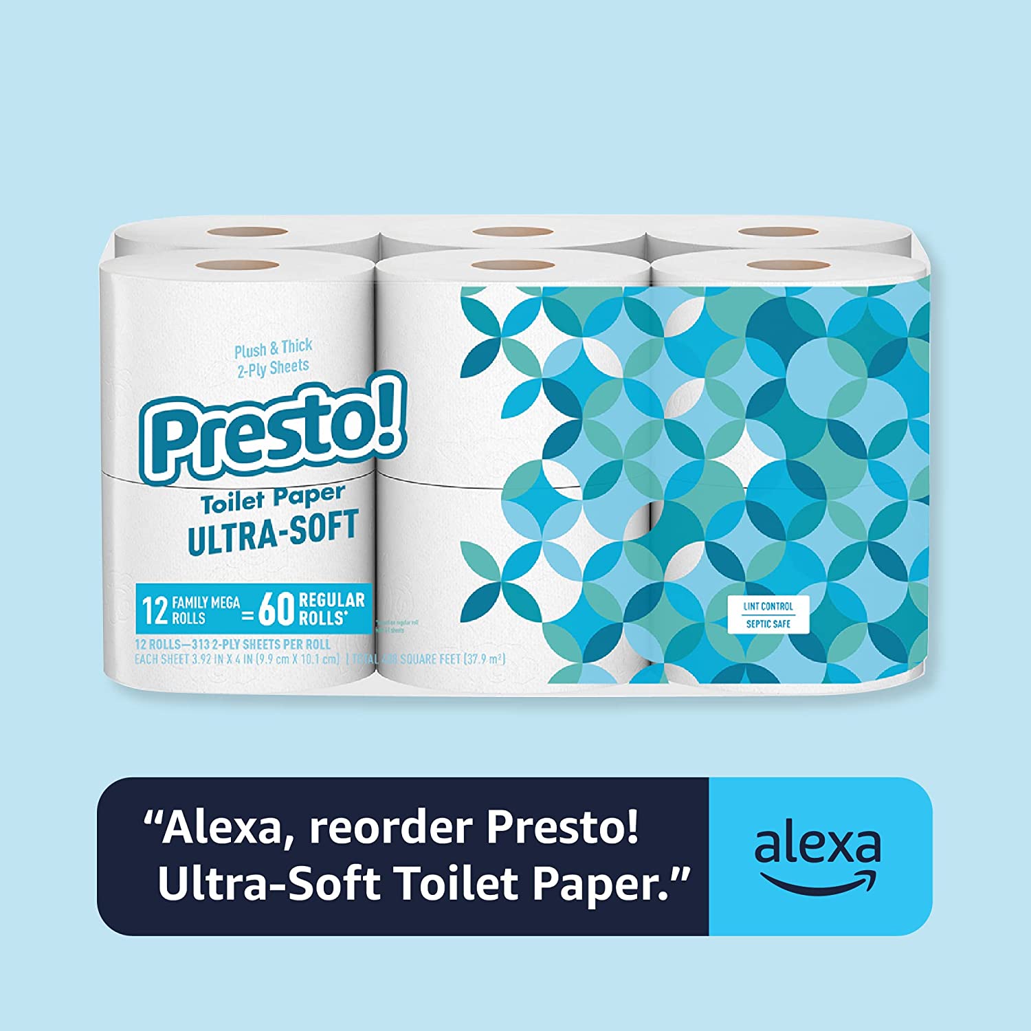 • Running low? Restock by asking, “Alexa, order Presto! ultra-soft toilet paper” through your Alexa device