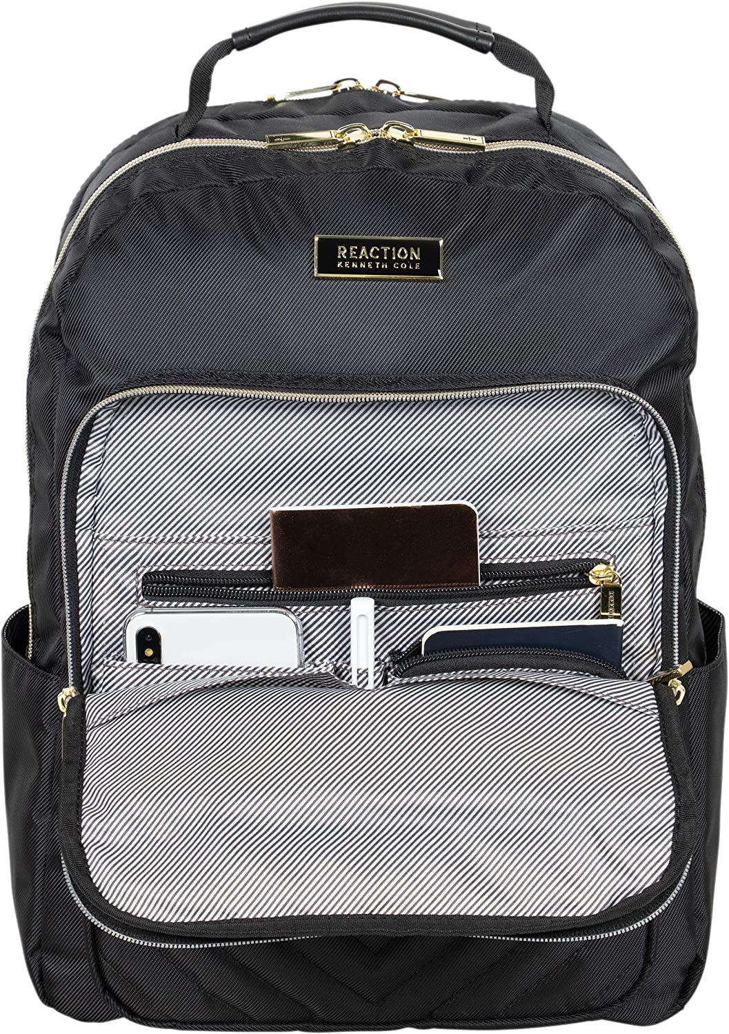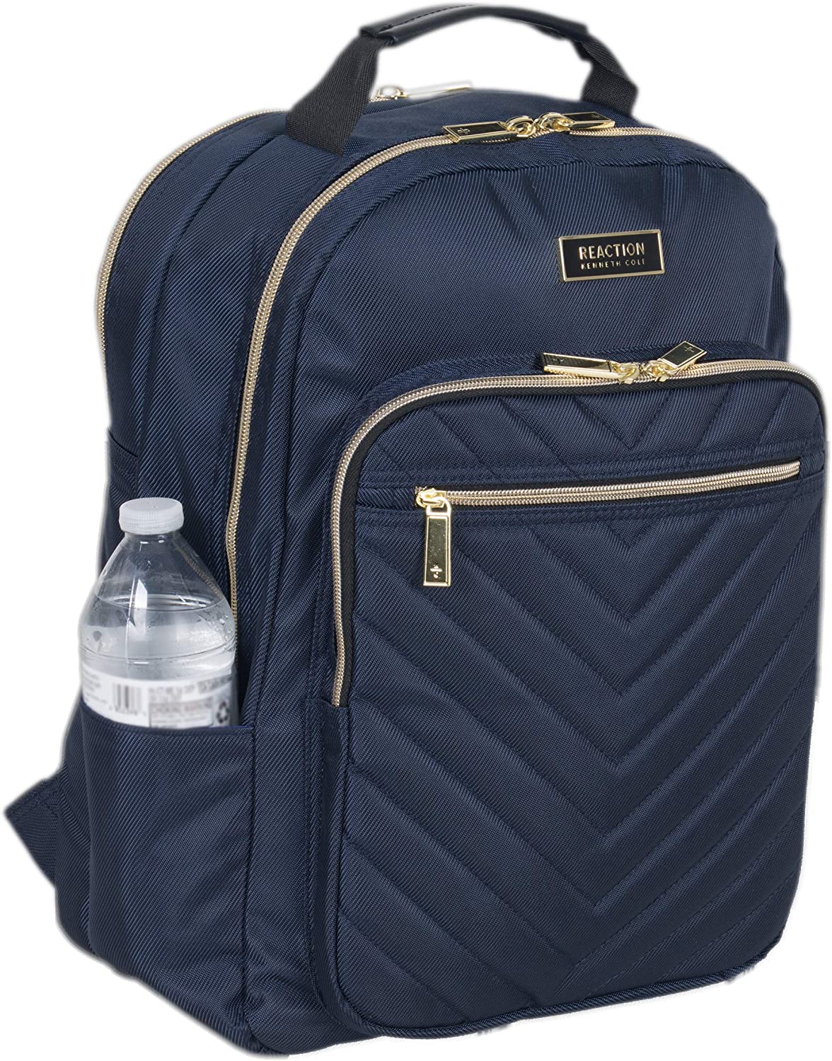 Sleek and sophisticated, this chevron quilted laptop backpack from Kenneth Cole Reaction is perfect for professionals on the go. Features a roomy fully lined interior with multiple interior pockets for all your needed essentials. Loaded with features, including a separate padded laptop compartment that holds most laptops with up to a 15-inch screen, a padded tablet pocket in the main compartment, multiple zippered accessory pockets, and dual exterior beverage holster pockets. The exterior features a trolley tunnel to fit over luggage trolley handles for hands free carrying, and a sturdy padded top handle for easy carrying. The perfect fashion-forward laptop backpack to keep your business essentials fashionably organized while on the go. ★ Overall size: 16” H x 11” W x 7.5” D. ★ Computer Compartment Size: 15.25” H x 10” W X 1.75” D. ★ Product Weight: 2.15 lbs. ★
