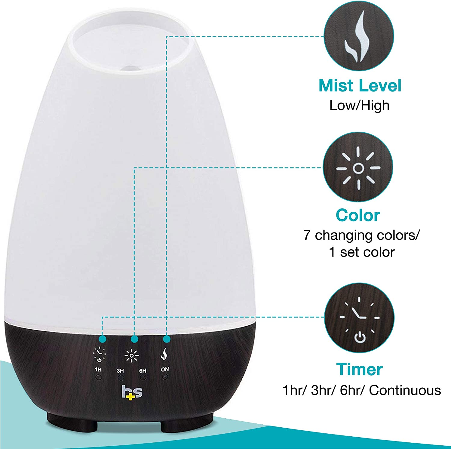 DIFFUSER FOR ESSENTIAL OILS features a smart touch panel to easily control the lighting, high or low mist mode and a 1hr/3hr/6hr timer that will keep misting until the water runs out.