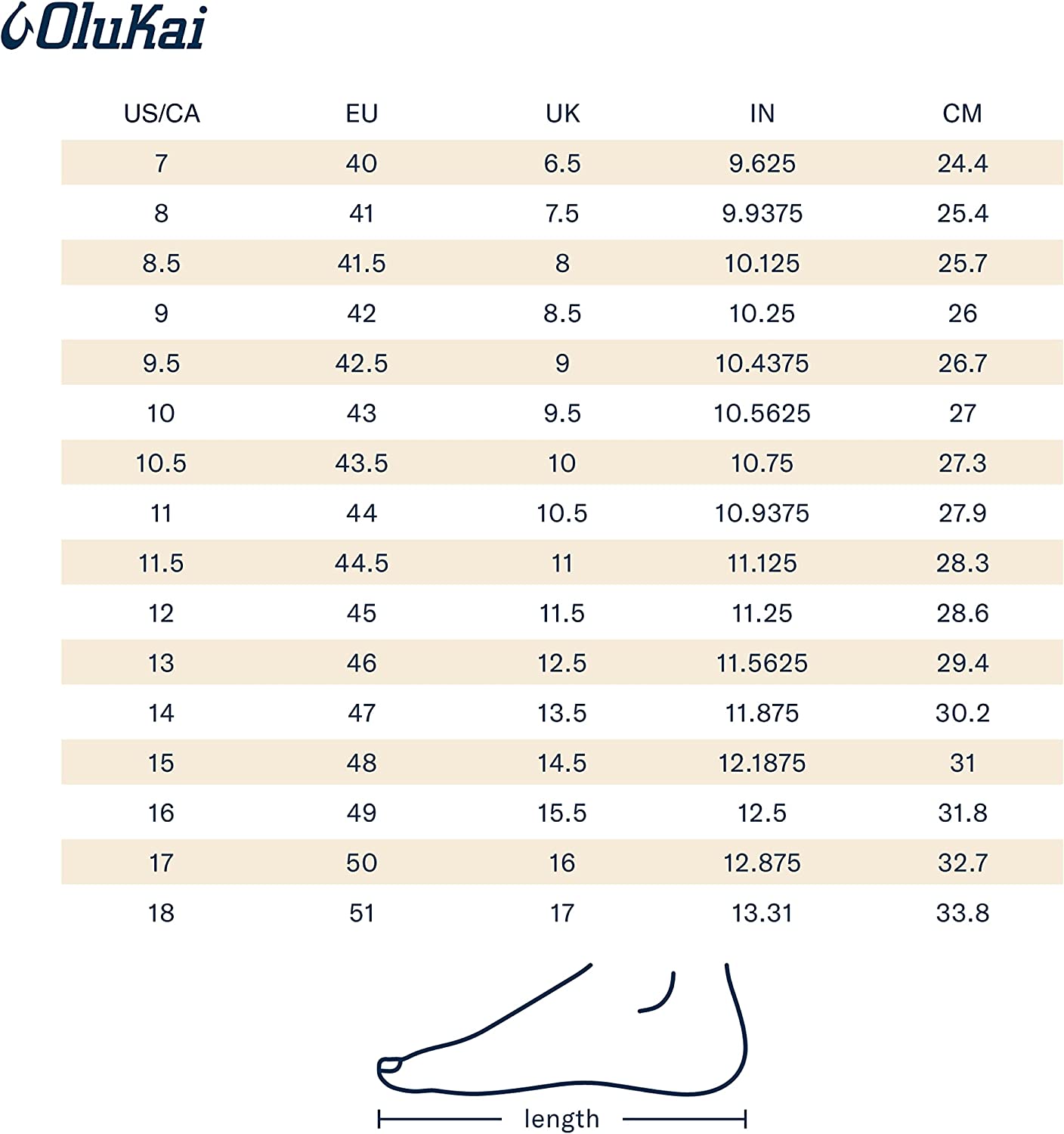 • ONE YEAR WARRANTY: As a testament to our quality construction, all OluKai footwear is backed by a guarantee against manufacturer’s defects for one full year from the date of purchase, including defects such as frayed or loose stitching and straps pulling out where soles are not excessively worn. Footwear covered by the guarantee will be replaced at Olukai’s discretion. See our website for more information.
