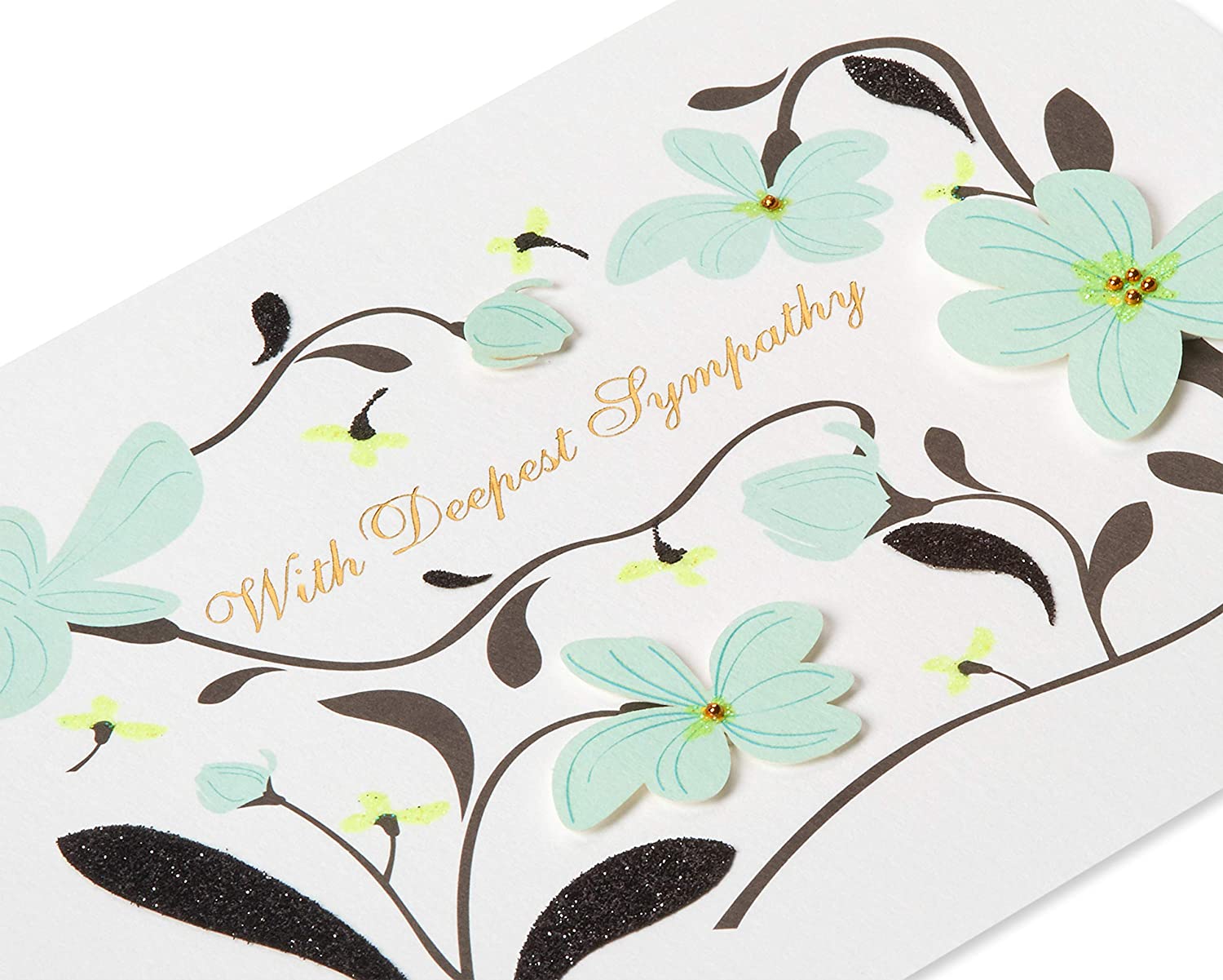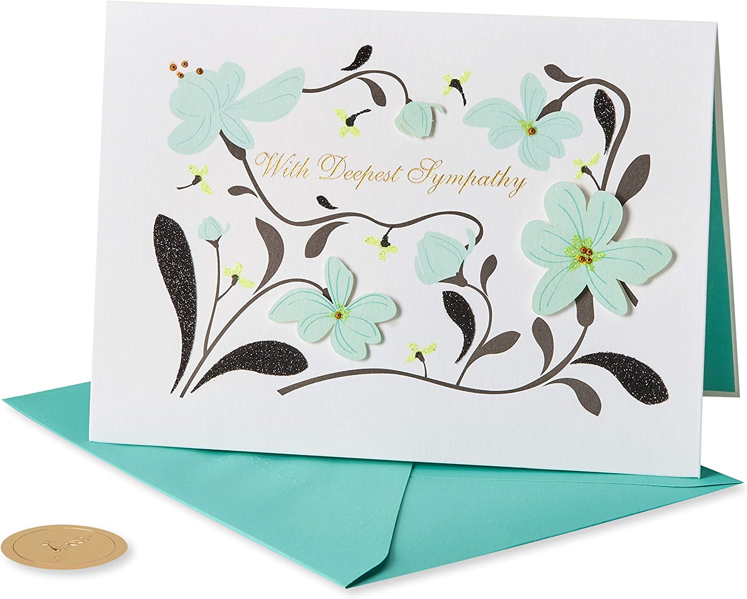 Let them know you’re thinking of them with this hand-crafted sympathy card from Papyrus. Featuring a lovely floral design in light aqua and embellished with beads, foil, glitter, and paper-sculpted petals, the elegant art is complemented by a simple-but-heartfelt message in beautiful gold script. A matching aqua blue envelope and gold foil seal are included, and extra postage is required.