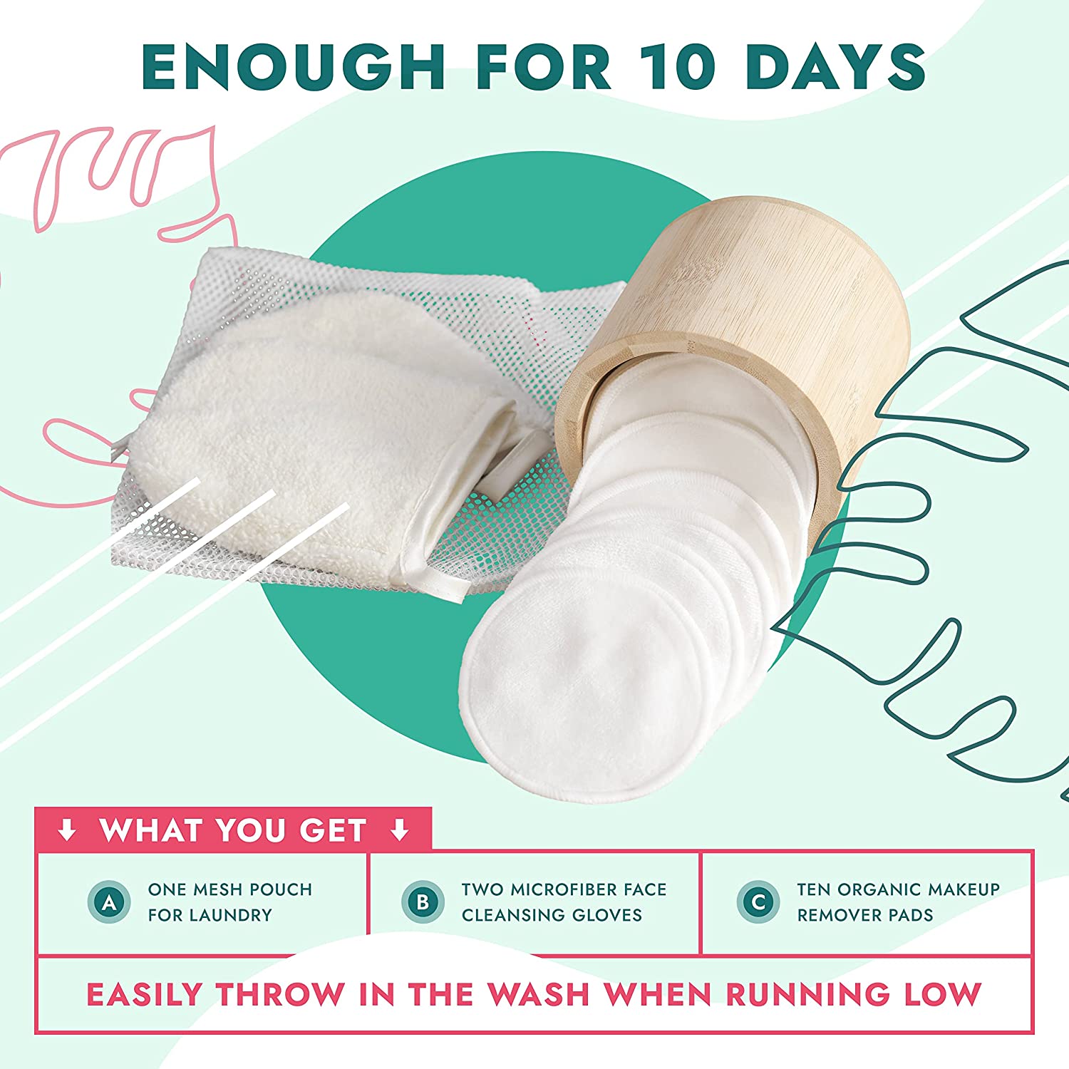 • 13 PIECE BUNDLE INCLUDES: 10 pieces 100% Organic Bamboo/Cotton makeup remover pads, 2 pieces 100% Microfiber facial cleansing gloves, 1 reusable laundry bag. Pads measure 8cm (3.15’’) in diameter; Gloves measure 10cm (4’’) in diameter.