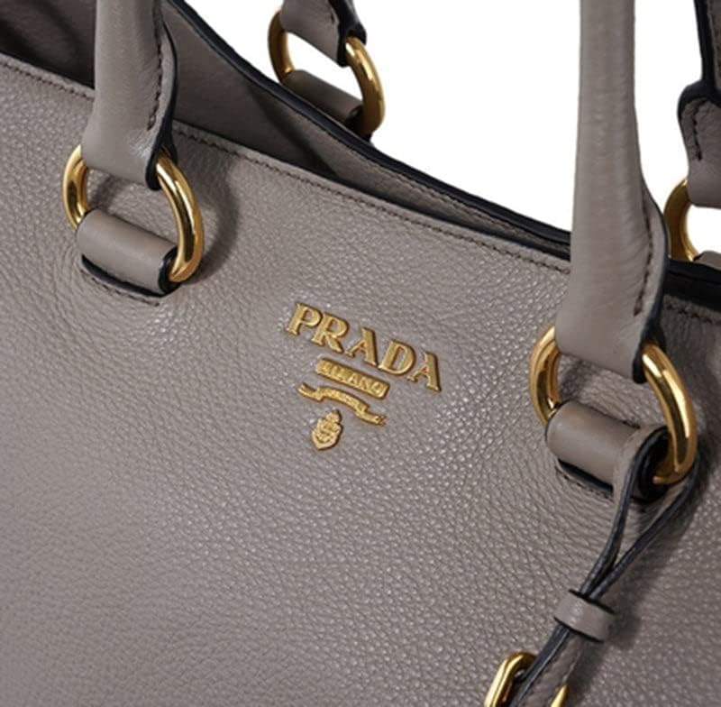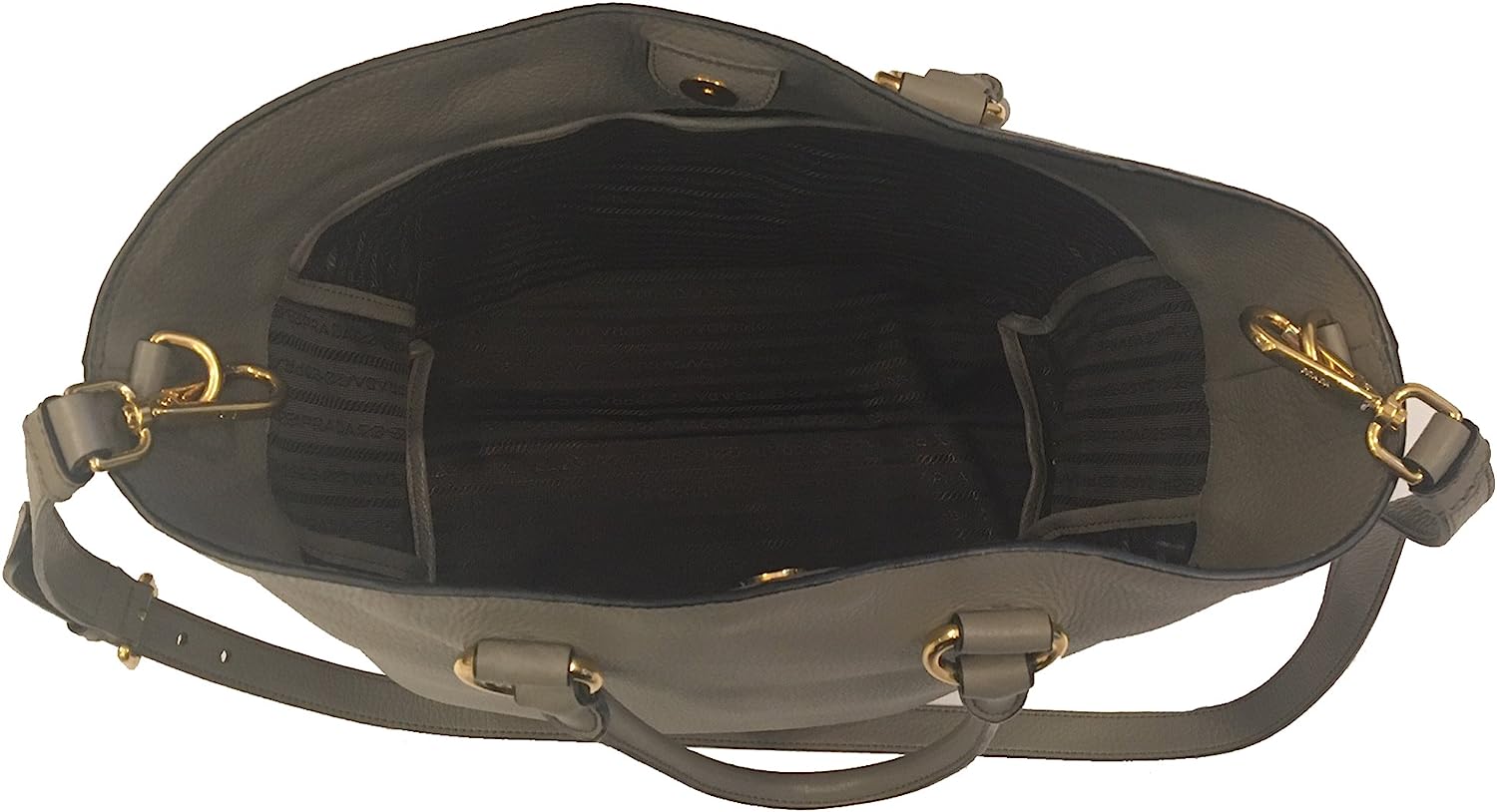 Prada luxury gray leather shopping tote features a large open interior with two magnetic close slip pockets and one zippered inside pocket. Comes with a nice detachable ID tag and removable, adjustable shoulder strap