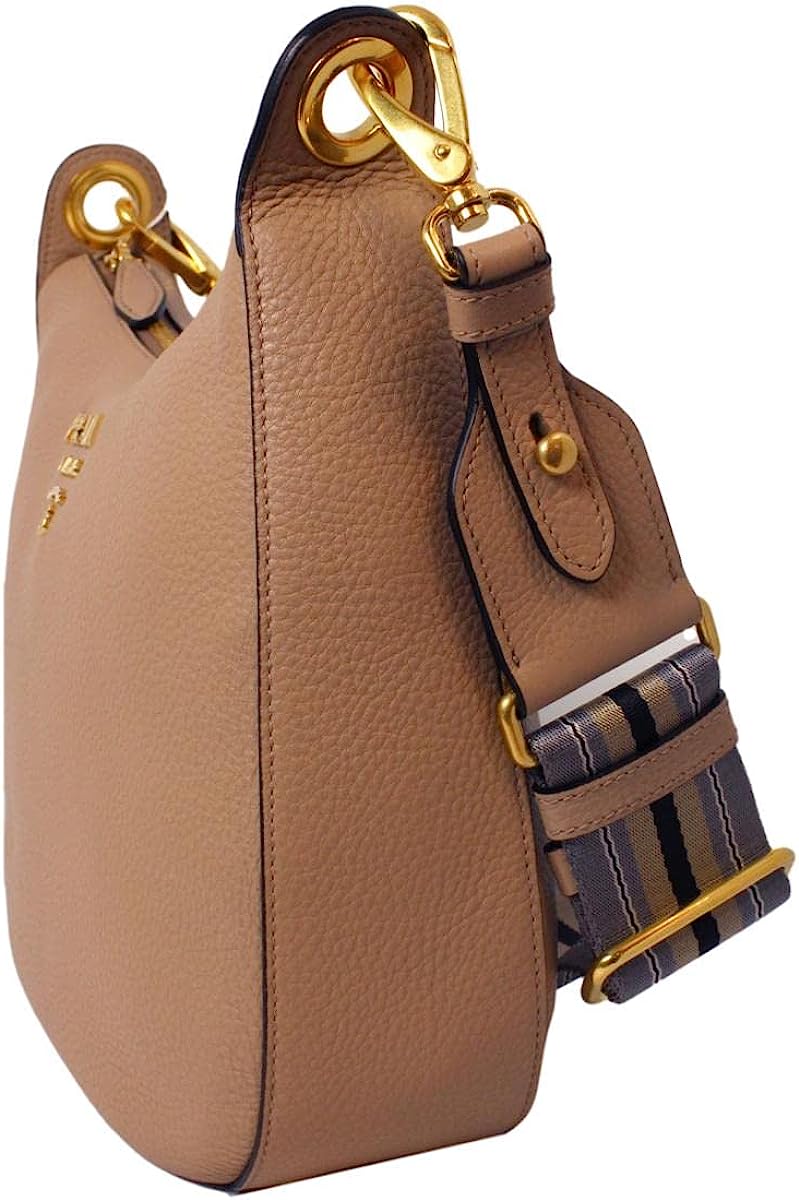 Tan leather with gold Prada Paris logo and silver and blue nylon web striped strap