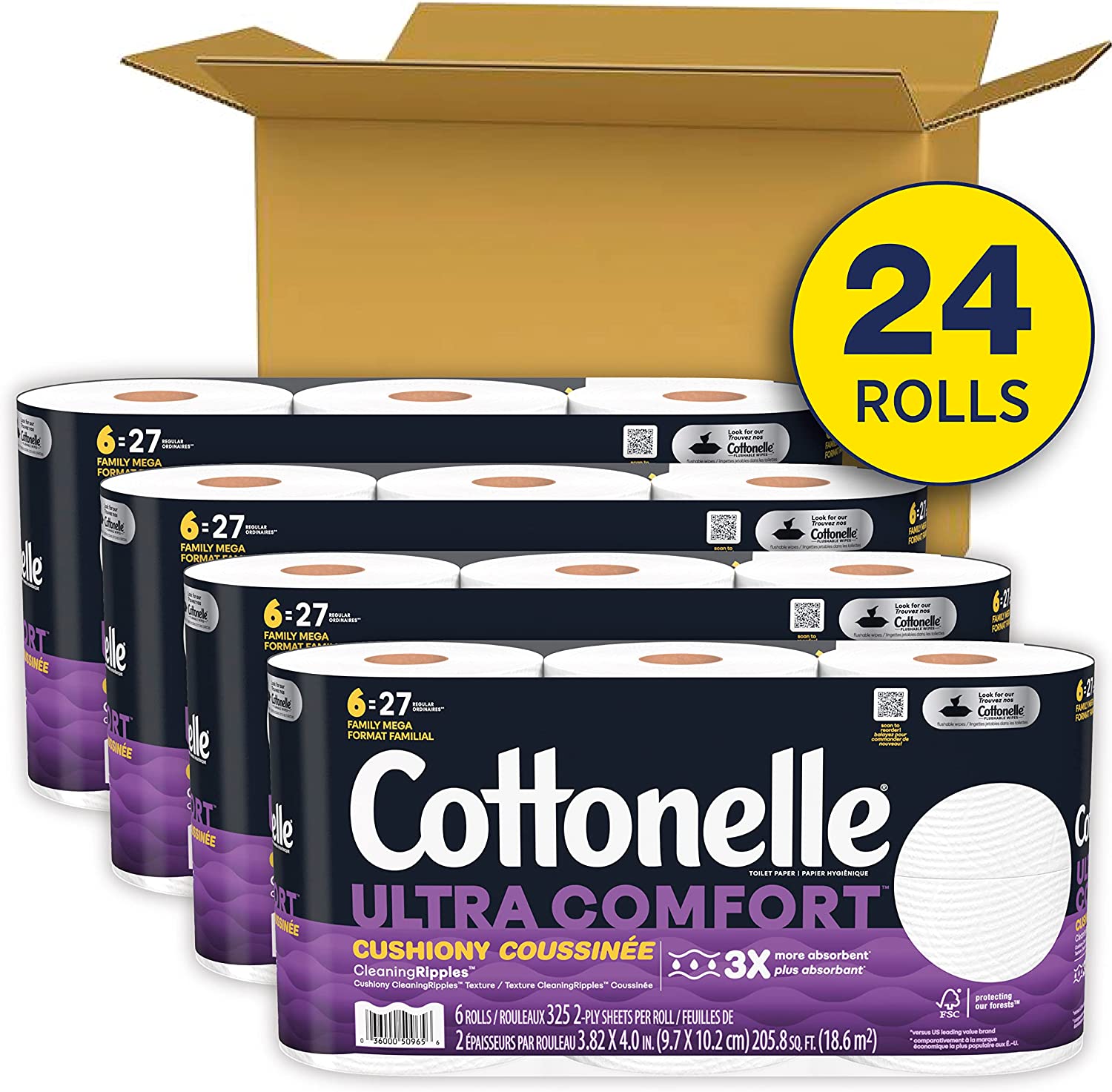 Cottonelle Ultra Comfort Toilet Paper with Cushiony CleaningRipples Texture, 24 Family Mega Rolls (24 Family Mega Rolls = 108 Regular Rolls) (4 Packs of 6), 325 Sheets per Roll, Packaging May Vary