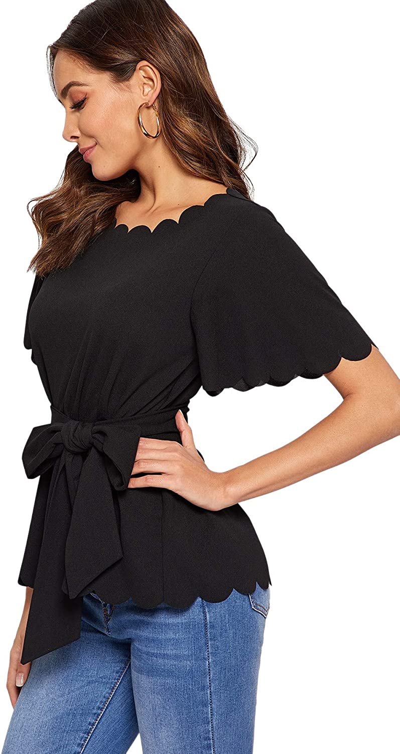 Romwe Women's Bow Self Tie Scalloped Cut Out Short Sleeve Elegant Office Work Tunic Blouse Top