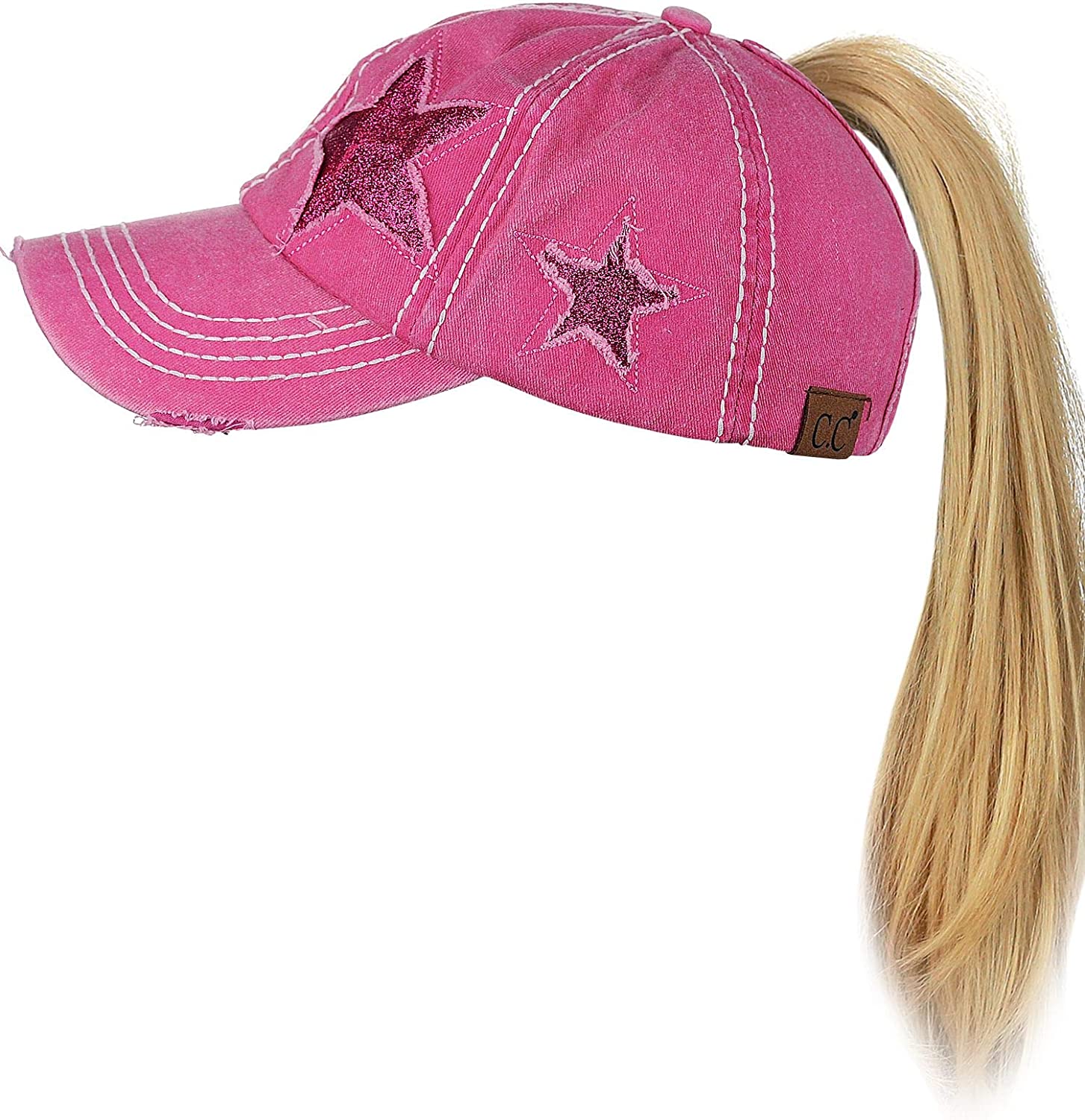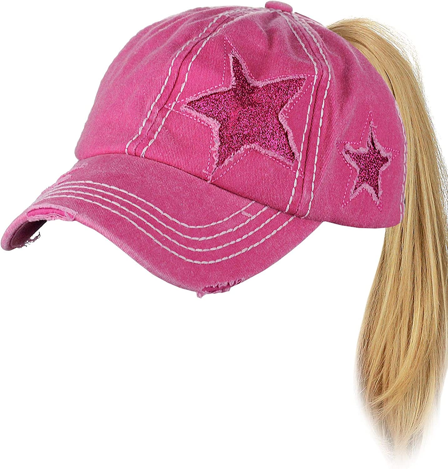 C.C Ponycap Messy High Bun Ponytail Adjustable Glitter Star Distressed Baseball Cap Hat