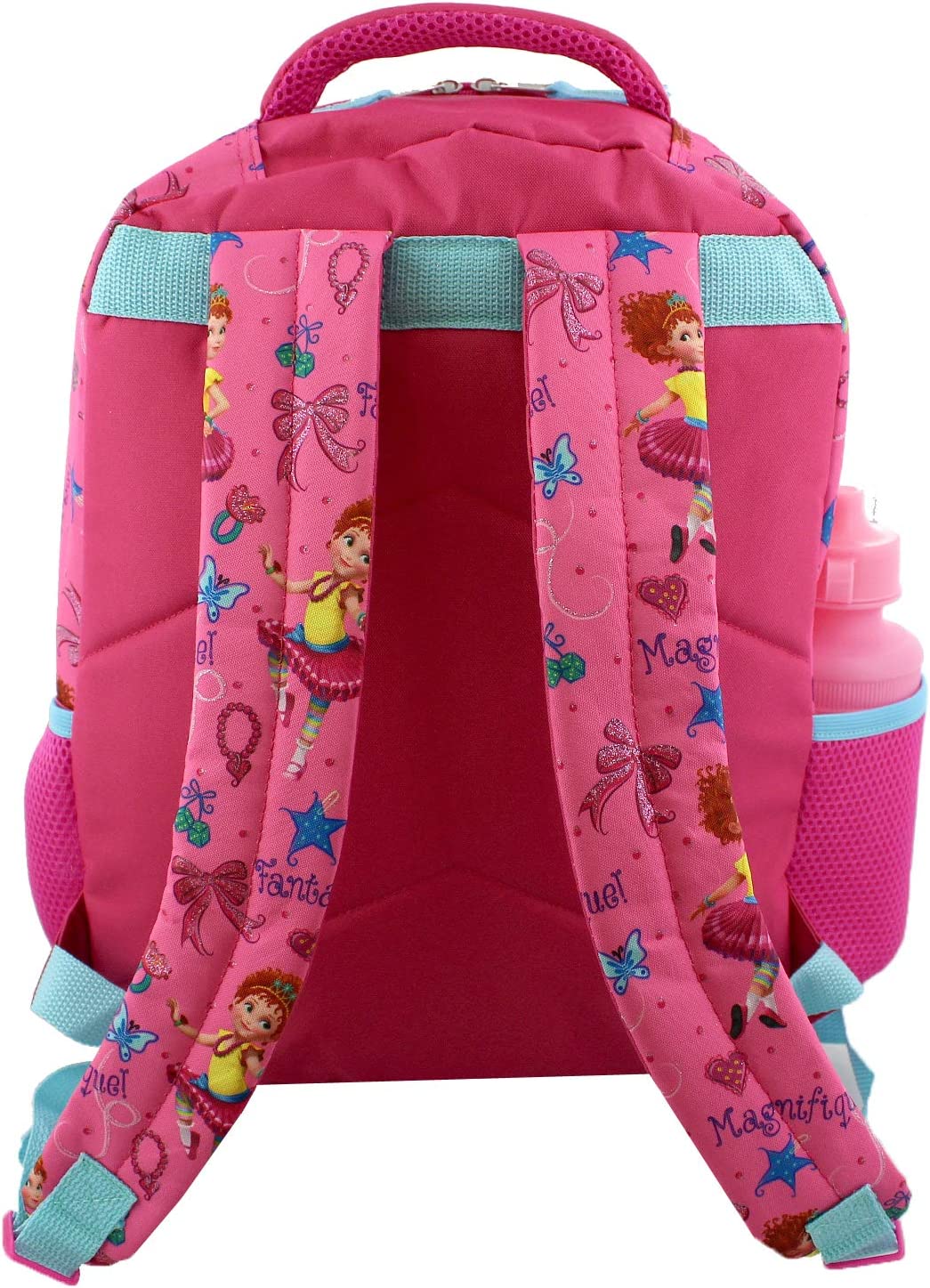 Get ready for the day with this stylish Yankee Toy Box exclusive Fancy Nancy backpack and snack bag school set! This set includes a 16 inch backpack, a fold-able insulated snack bag, a soft utility pencil case, a drawstring sack, and a pop top water bottle. You can easily carry books, gym clothes, pencils, and other school supplies! The day pack features a roomy main compartment, two side pockets, and a front zip compartment that is perfect for smaller supplies. The book bag can be hung up when not in use by the padded locker loop. The matching snack bag makes snack time fun and exciting with a thinly insulated interior, hook and loop closure, and a holding strap for easy carrying. This Fancy Nancy school bag is designed in durable fabric with adjustable padded shoulder straps and a padded back for added comfort. The side mesh pockets are made from durable athletic mesh. The soft accessory case and is great for storing smaller items. This set features your favorite Disney Jr. Fancy Nancy character: Fancy Nancy! It's the perfect travel, school, or camp set for any girl or toddler girl that loves Fancy Nancy!