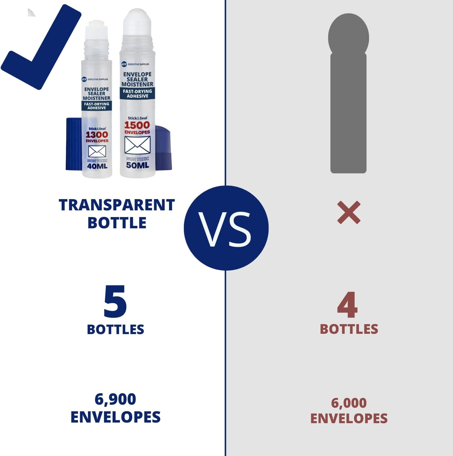 PACK SIZE: Each pack of our envelope moistener contains 5 bottles of quality envelope sealer. 2 bottles each contains 50ml adhesive, enough to safely secure more than 1500 envelopes. The extra 2 bottles each contains 40ml adhesive and can each seal more than 1300 envelopes. (Total 5,6900ML)