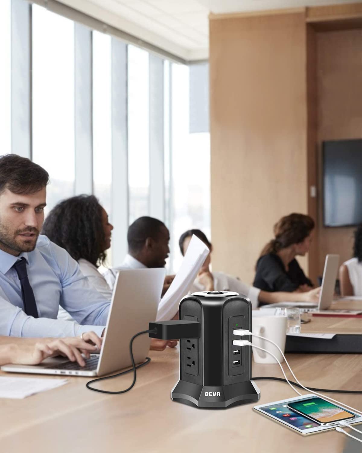 Power Strip Tower Surge Protector BEVA 10ft Flat Plug Desktop Charging Station 9 AC Outlets 4 USB Ports, 900 Joules, Long Extension Cord for Home Office Appliances Smartphones Computer Tablets(Black)
