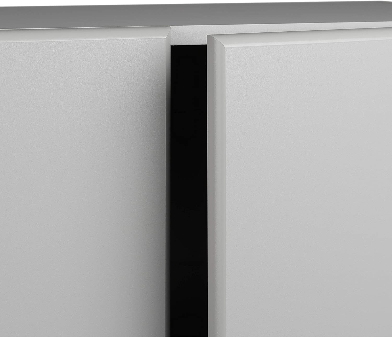 FREESTANDING STORAGE CABINET: Features 2 soft-edge doors on adjustable 6-way European style hinges, 2 adjustable shelves, and one fixed shelf all in a light gray laminate finish with satin nickel-finished metal handles
