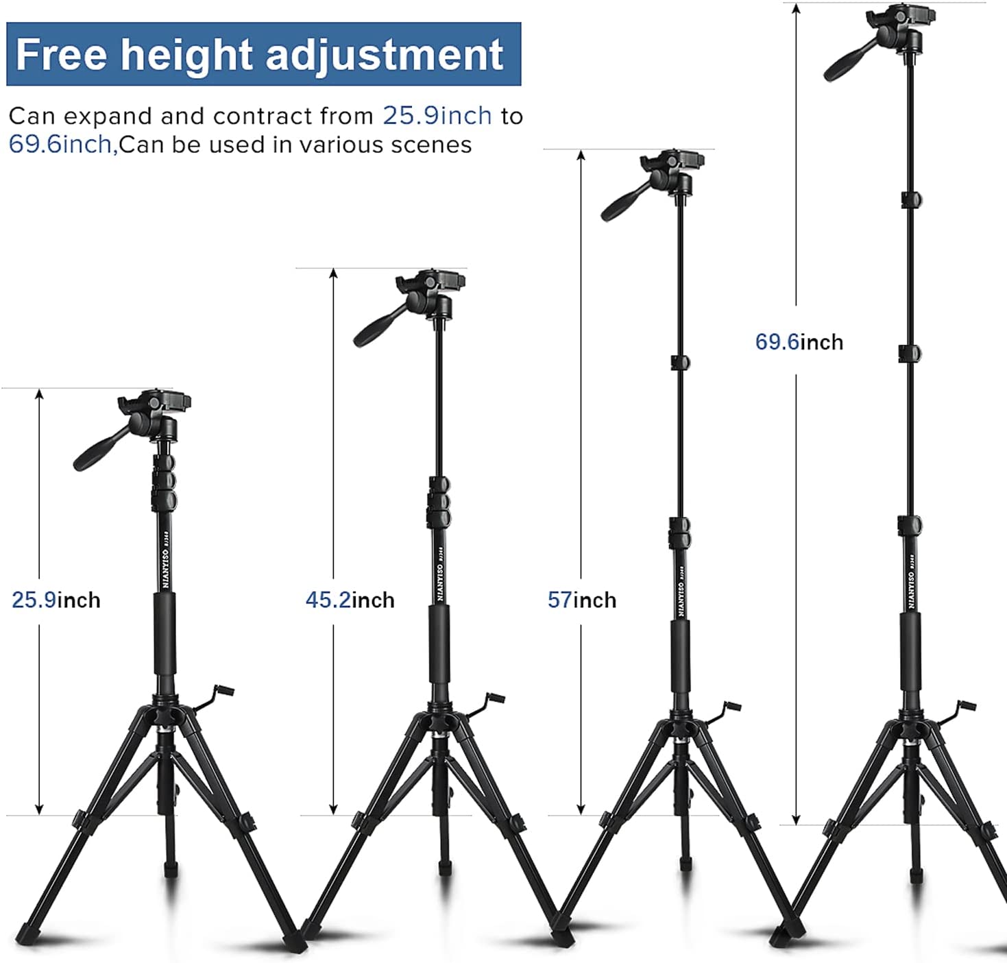 【Adjustable-height Matches Your Needs】 Camera stand can expand from 25.9 inches to 69.6 inches, which is suitable for children and adults. universal 1/4" screw can support most cameras like Canon Nikon. When used as phone tripod, it can take photos and videos, live broadcast, facetime, do the vlog, self-taking, tiktok.