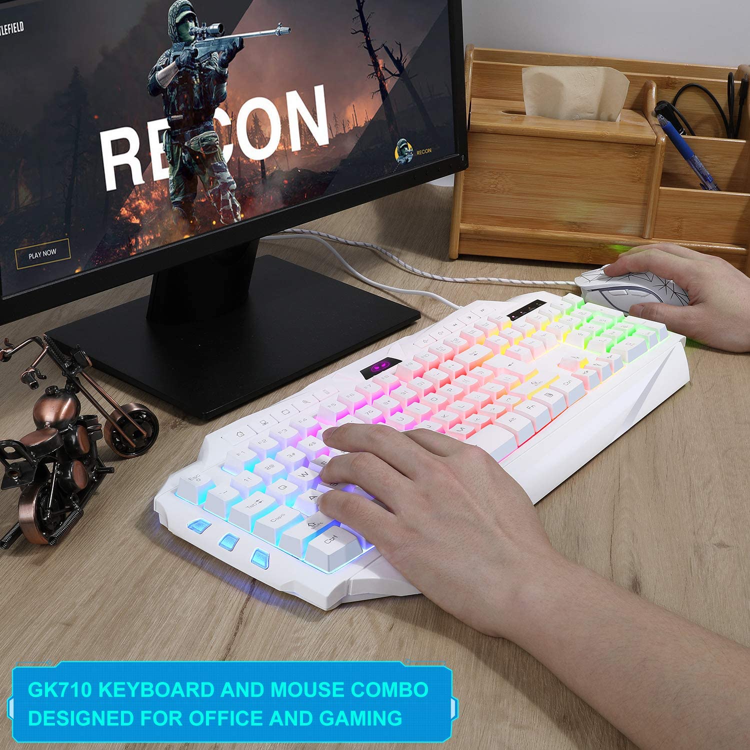- ?【Ergonomically Designed Gaming Work Keyboard and Mouse Set】Carefully designed ergonomic high and low keys, suitable for long hours of hand tapping and typing, comfortable finger movement, smooth input without lag. By FN+F1-F12 combination. Quickly switch between multimedia playback, volume adjustment and other functions Convenient and fast!