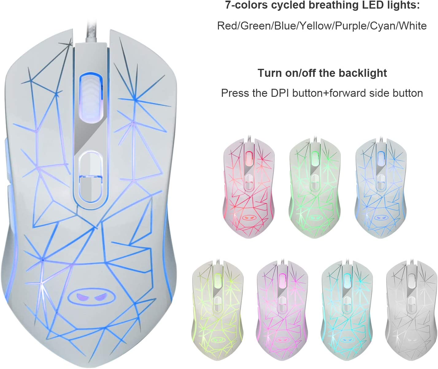 - ?【7 Colors Breathing Backlight System】The gaming mouse has 7 dazzling color breathing backlight, supports 4 levels of DPI adjustment, and has internal indicator lights, so when you are playing games, you can play at high DPI, move faster on your screen, do some quick responses and give you an unparalleled sense of gaming experience.