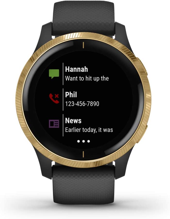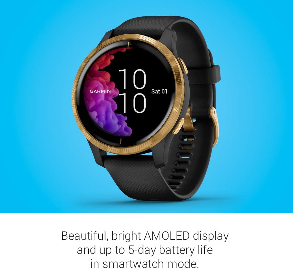 Garmin 010-02173-31 Venu, GPS Smartwatch, Bright Touchscreen Display, Features Music, Body Energy Monitoring, Animated Workouts, Pulse Ox Sensor and More, Gold with Black Band