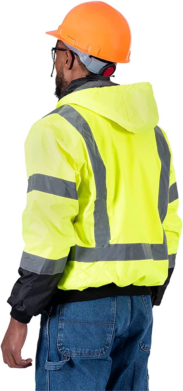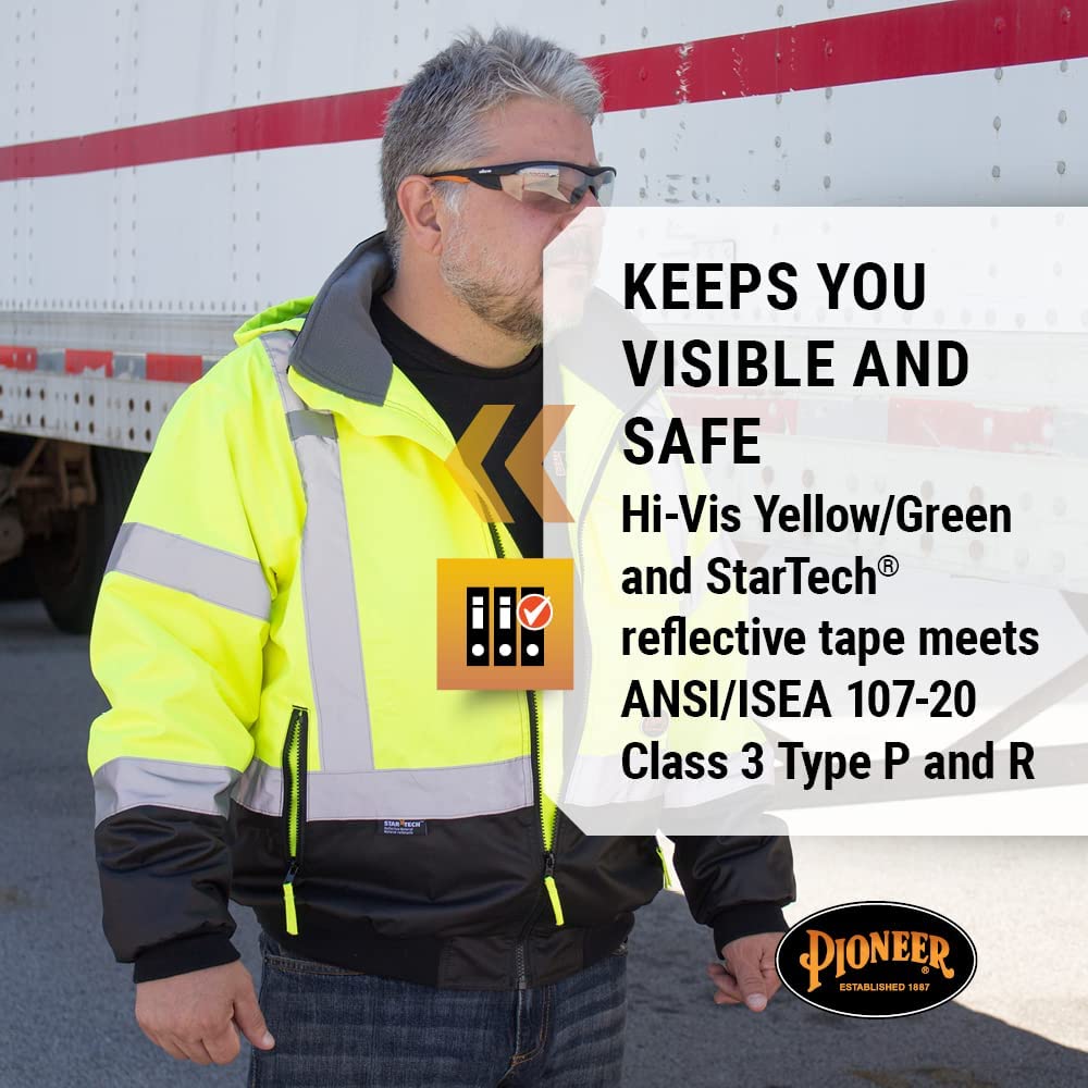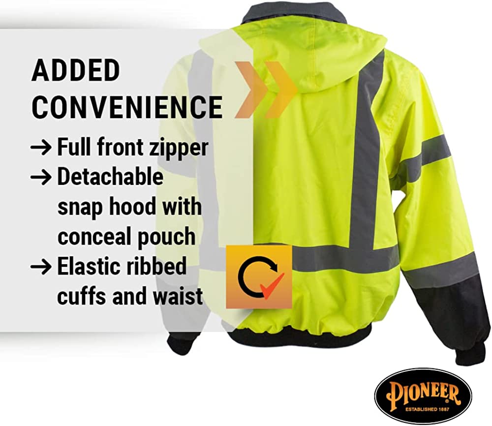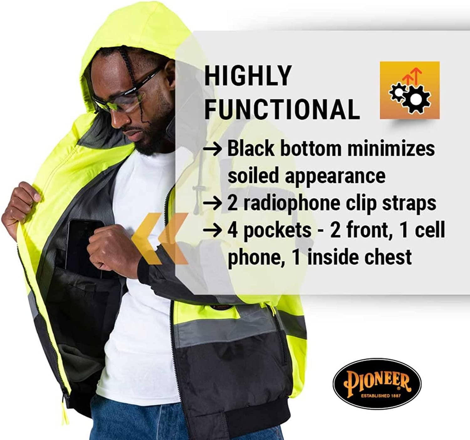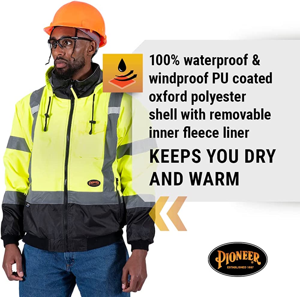 Pioneer High Vis Safety Bomber Jacket For Men – Waterproof Reflective Rain Gear – Class 3 – Detachable Hood – Yellow/Black