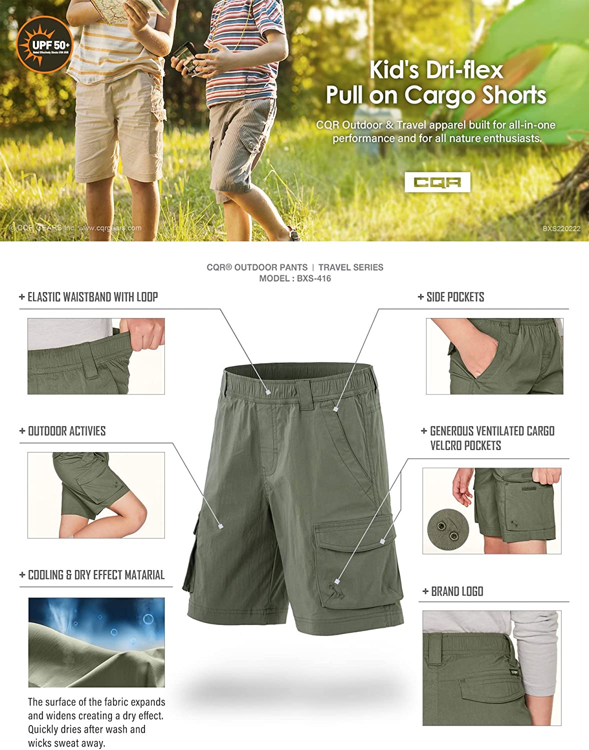 CQR Kids Youth Pull on Cargo Shorts, Outdoor Camping Hiking Shorts, Lightweight Elastic Waist Athletic Short with Pockets