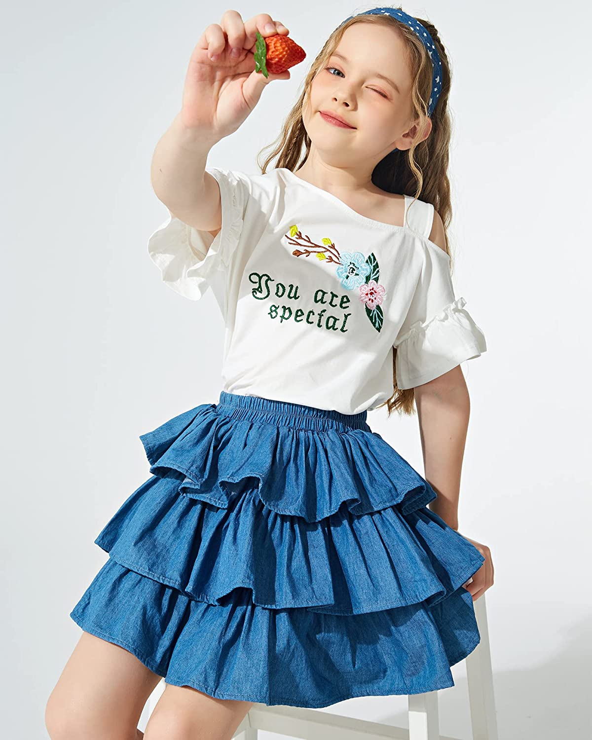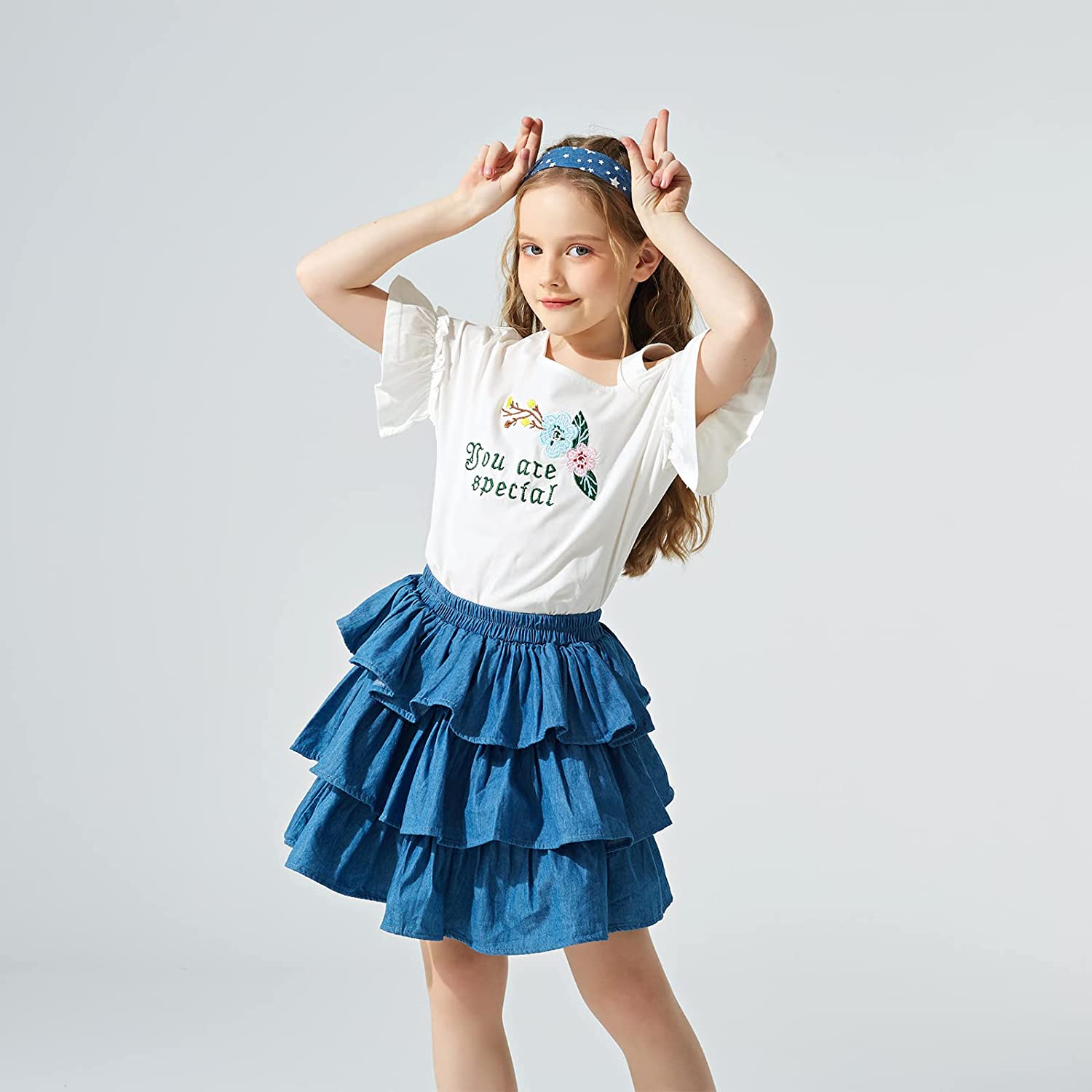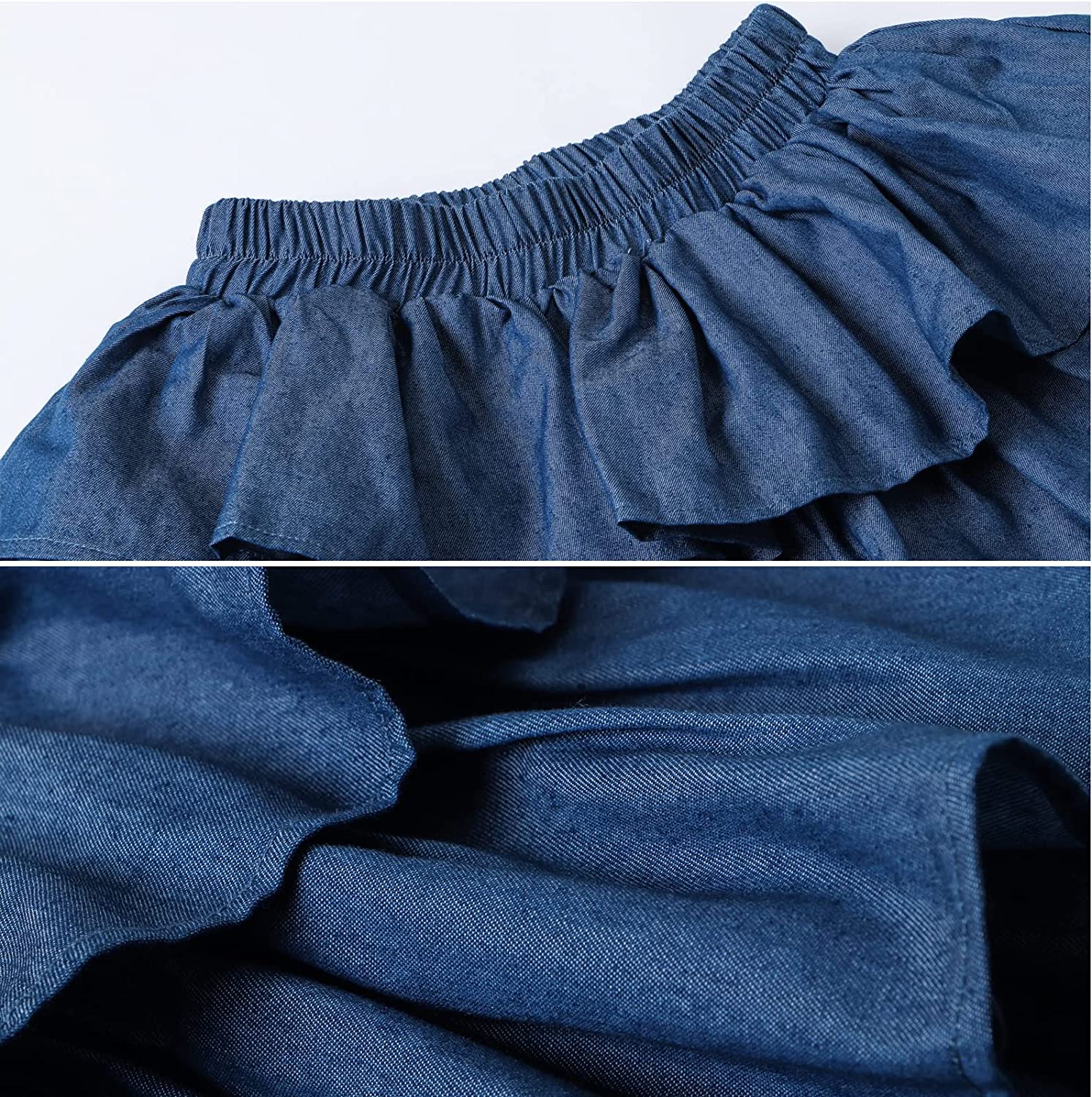 Girls Skater Skirt Denim Solid Color Denim Skirt with Lace Hem