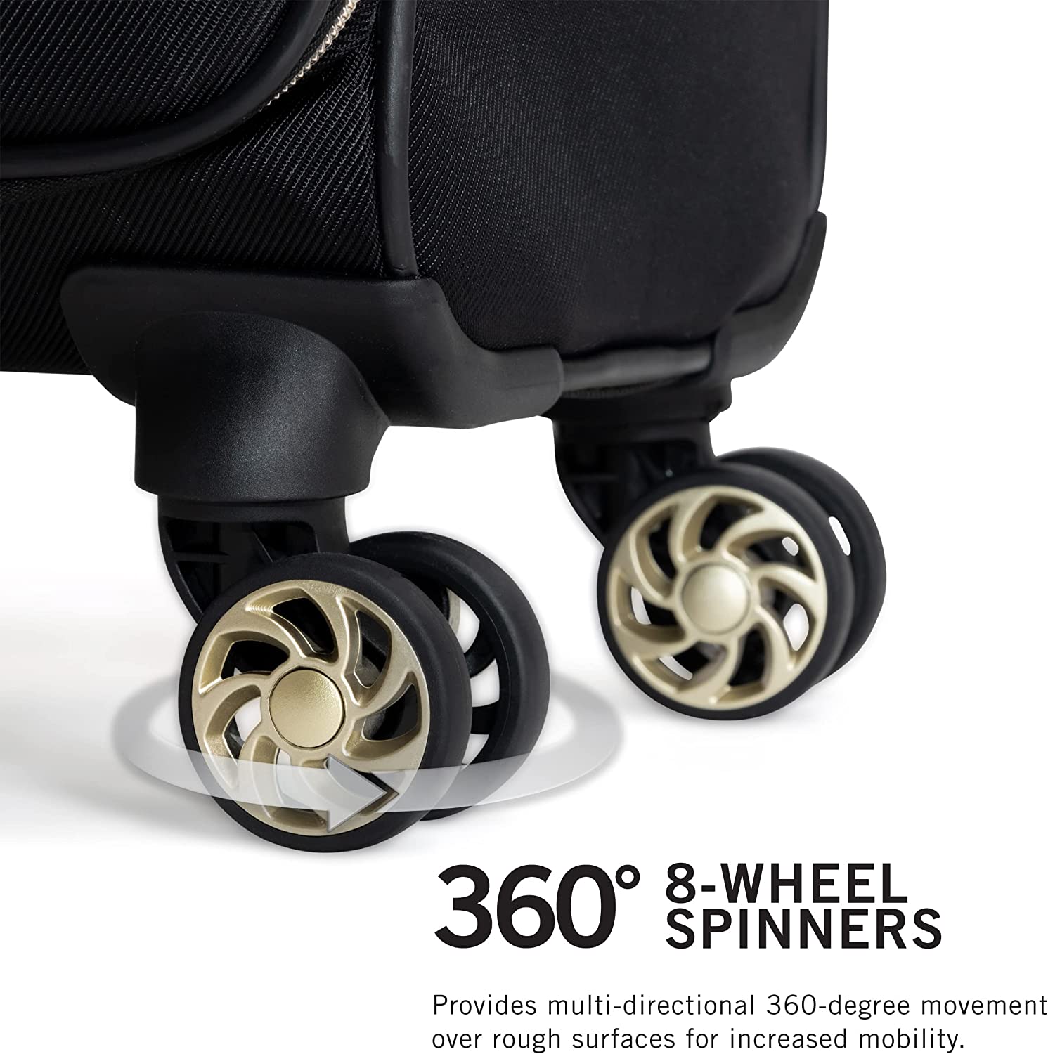 Finally, travel made trendy with the stylish polyester-twill chevron luggage from Kenneth Cole Reaction’s Chelsea luggage collection. Complete with a fully lined, tear-resistant interior, this luggage also expands an additional 2.0 inches, ensuring that you have plenty of space for all your needed belongings. Its lightweight construction helps you meet airline weight restrictions to avoid unnecessary airport fees, while its 8-wheel spinners provide effortless 360-degree navigation allowing you to glide quickly through the airport. The main compartment interior features a hanging side zipper pocket and garment restraints to hold belongings in place. The under-the-lid section includes a mesh zipper pocket and a transparent, clear PEVA gusseted pocket for toiletries. The front exterior also features a small zipper pocket for easily accessible items and a large gusseted zipper pocket for additional storage organization. Padded top and side handles allow for easy maneuvering, and a bottom grab handle allows for easier lifting. Additionally, a retractable trolley handle extends to be 41 inches tall with a locking push button mechanism. Fashionable and functional, Chelsea luggage also boasts fashion-forward gold hardware with premium self-repairing coil zippers designed for long-lasting use. Carry-on size meets most U.S. based airline carry-on size requirements and fits into most airline overhead bin compartments. Backed by a manufacturer 10-year limited warranty. ★ Overall Dimensions: 22.0” H” x 14.0” L x 9.0”-11.0” D. ★ Packing Dimensions: 20.0” H x 13.5” L x 8.5”-10.5” D. ★ Weight: 6.35 lbs. ★