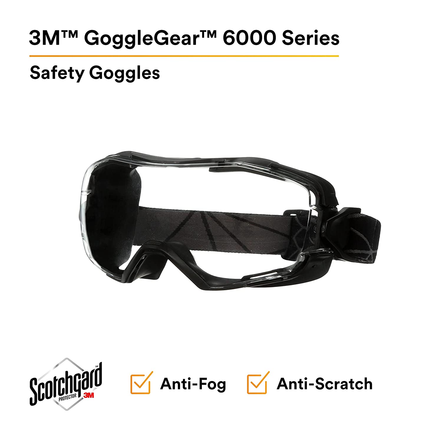 The 3M Goggle Gear 6000 Series is a larger-profile goggle design that features models with 3M Scotch Gard Anti-Fog Coating, or Traditional Anti-Fog & Anti-Scratch coating. All models come with indirect venting to help reduce fogging. Both adjustable nylon fiber cloth strap, or neoprene strap, are available within the 3M Goggle Gear 6000 Series.