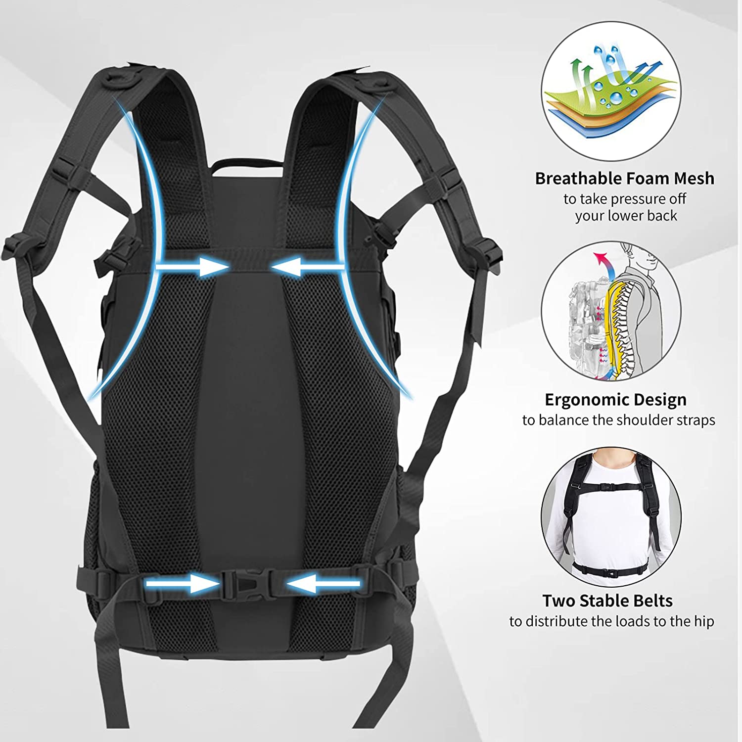 • ✅ STABLE STRAPS: The chest and waist straps with fasten buckles make it easy for you to buckle the straps in seconds to stable the trekking backpack. The buckle strap on both sides and the 2 compression fasten buckle straps on the bottom enhance the army backpack’s stability when moving.