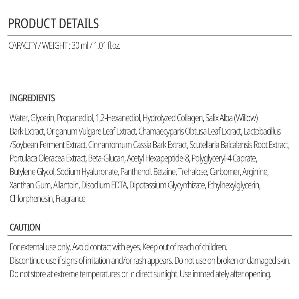 7 SYNERGY - The 7Synergy meets with collagen allowing a stronger firming skin. The 7 ingredients used are oregano, fermented bean, white willow, portulaca, scutellaria baicalensis, cassia bark, and cypress. These 7 ingredients have the effect of moisturizing, intensive hydrating, pore-care, soothing, softening, skin protecting, and nourishing in order. The interaction between the 7 botanic ingredients help restore healthy balance and vitality.