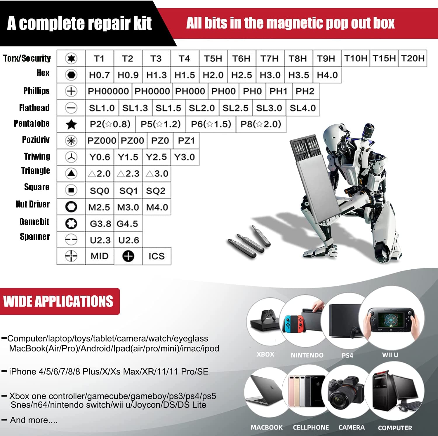 【UNIVERSIAL TOOLS SET】The premium screwdriver set is an ideal tool kit for computer, battery replacement,game consoles, cell phone, X-box, ipad, PC, tablets,children’s toys,TV, eyeglass, Switch, or other electronic maintenance