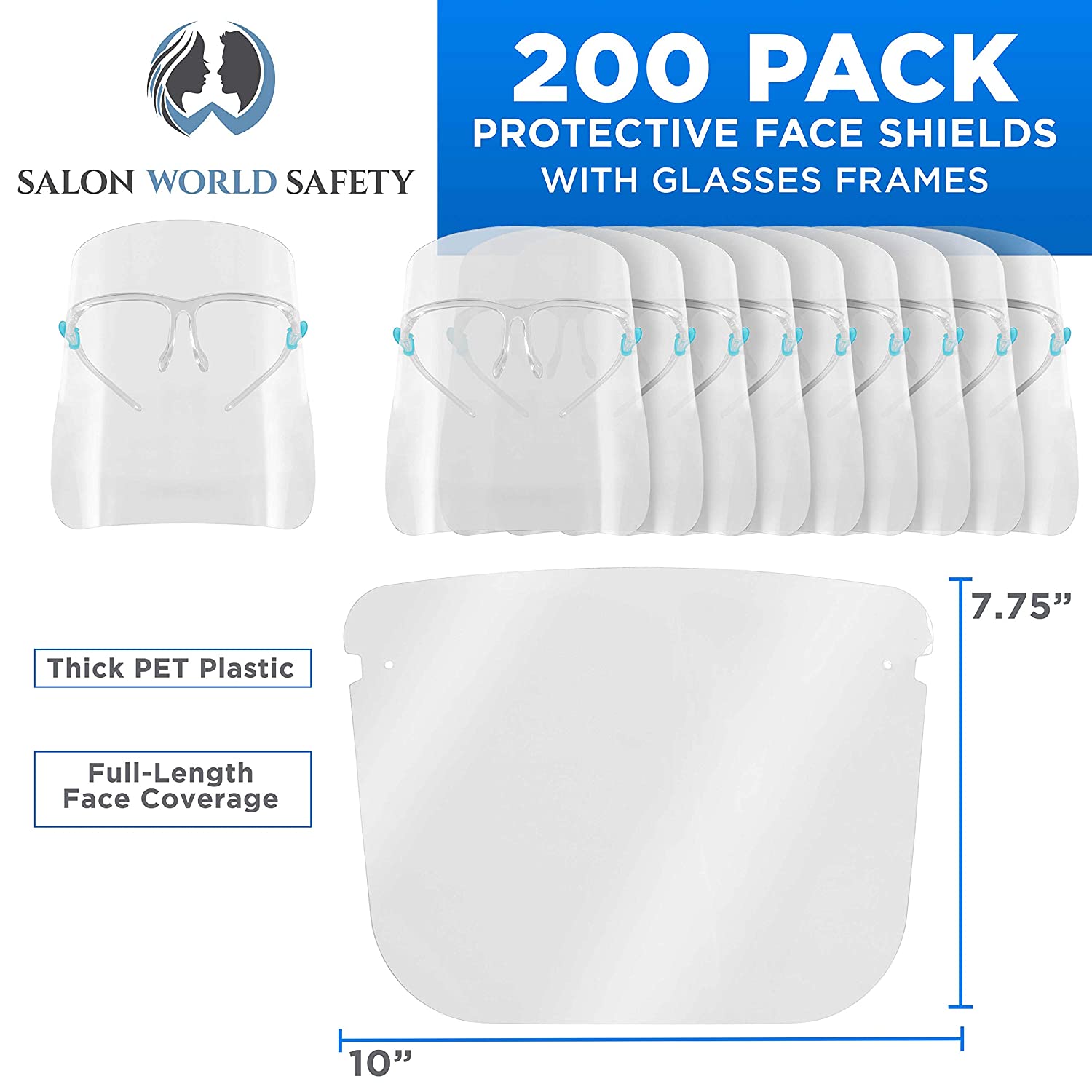 10 Pack of Face Shields with Glasses Frames: Sanitary, durable, lightweight, and comfortable premium protective face shields that are made with ultra-clear thick plastic. Each face shield contains an internally mounted comfort fit acrylic glasses frame. Wear the face shields just like you would when wearing glasses over your ears and on your nose bridge, but you'll also have a face shield for protection. Wear your eyeglasses underneath. One size fits all.