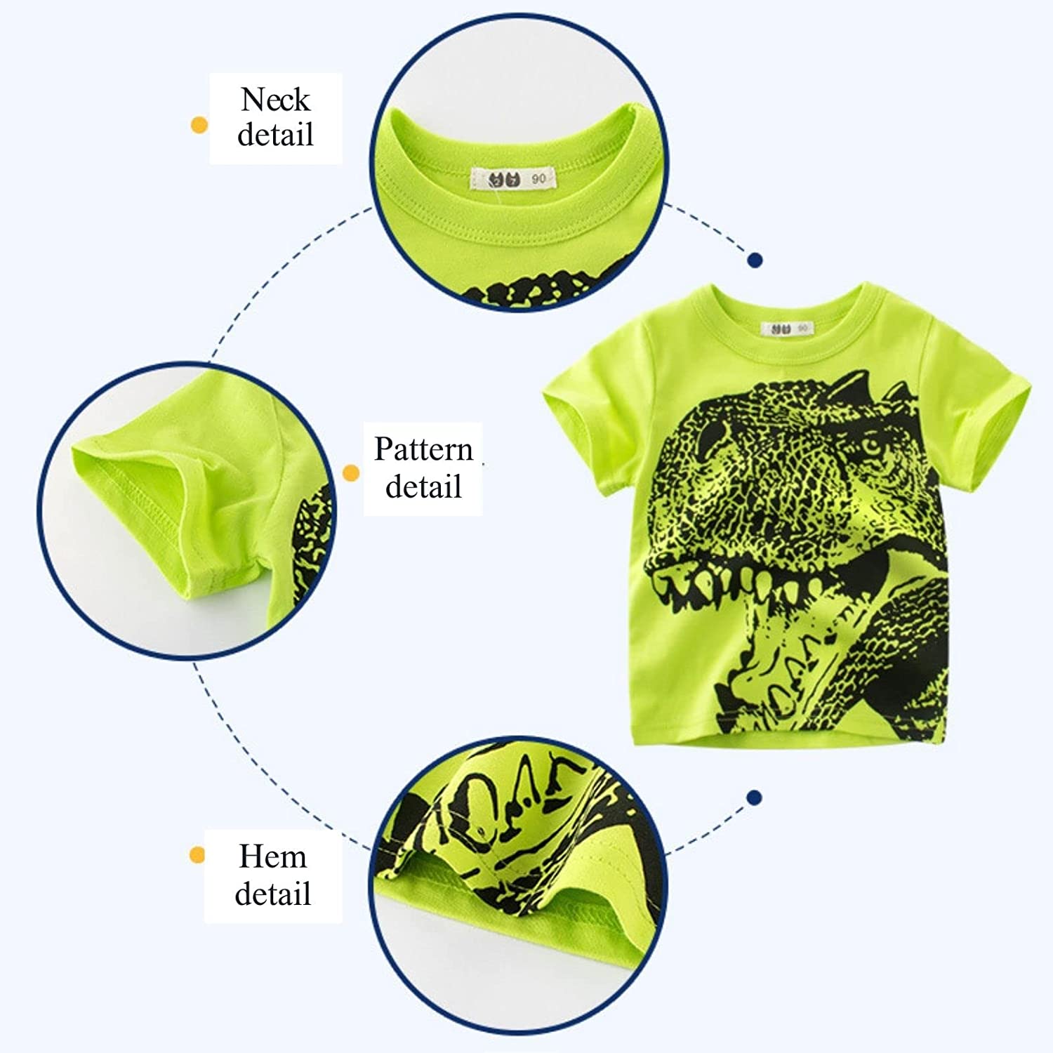 ?Cute patterns:Short-sleeved T-shirt sets of printed series with rich themes, cartoon 3D patterns of dinosaurs,cars,excavators,animals,etc.Cool and novel design will definitely make your boys exclaim and don't want to take them off.
