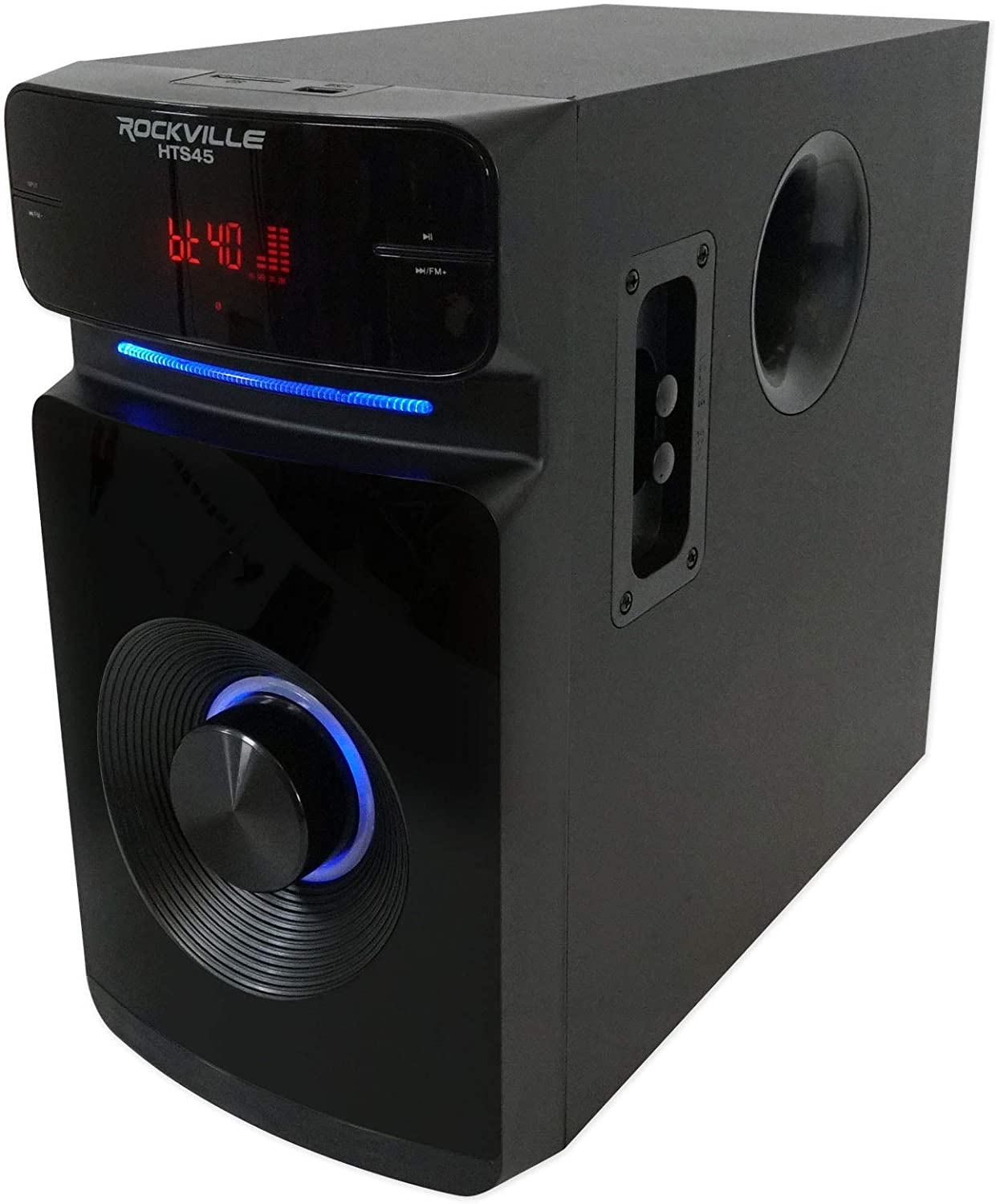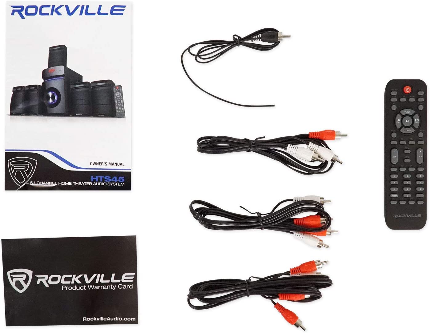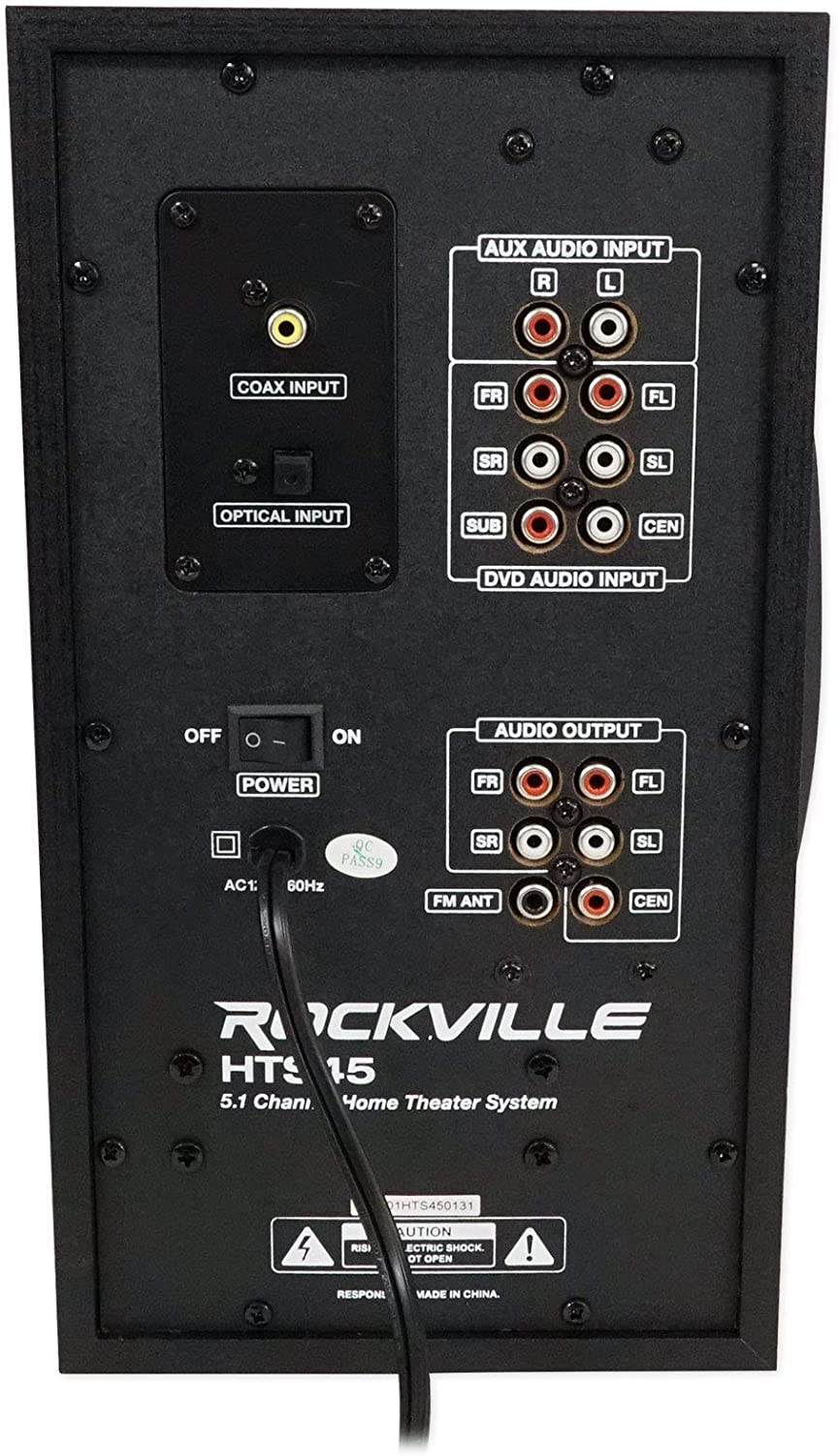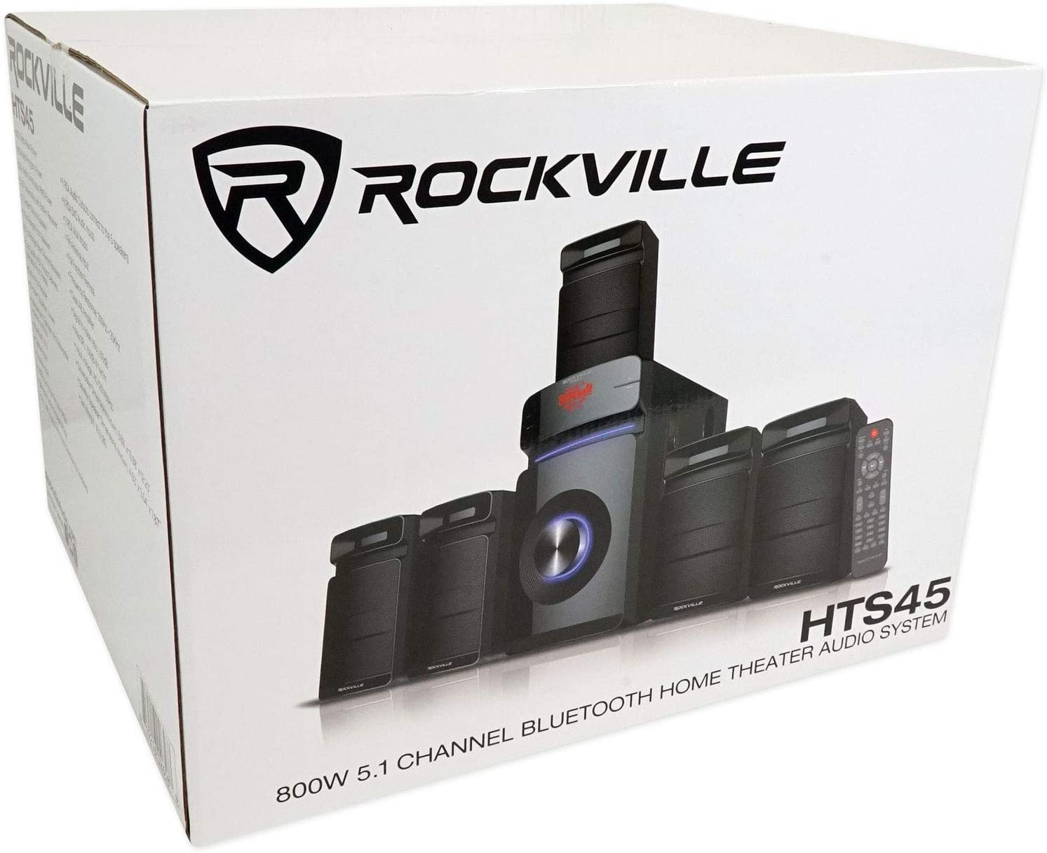 • Rockville HTS45 800w 5.1 Channel Bluetooth Home Theater Audio System+Subwoofer. 800 Watts Peak Power. 400 Watts Program Power. 200 Watts Continuous RMS Power. 5.25” Subwoofer with Built-In Receiver. 3” Center Channel Speaker. 3” Full Range Front Speakers. 3” Full Range Rear Channel Speakers. Top Quality MDF Wood Cabinets with Plastic Front Panels. Built-In FM Receiver with Amazing Reception. 5 Preset Equalizer curves. You can independently control the volume of each speaker and the subwoofer. Bluetooth v5.0. Optical Input. Coaxial Input. USB Input (max file size 64Gb). SD Input (max file size 64Gb). 2 ¼” MIC Inputs with Echo function for karaoke. 5 RCA Audio Outputs connect to the 5 speakers