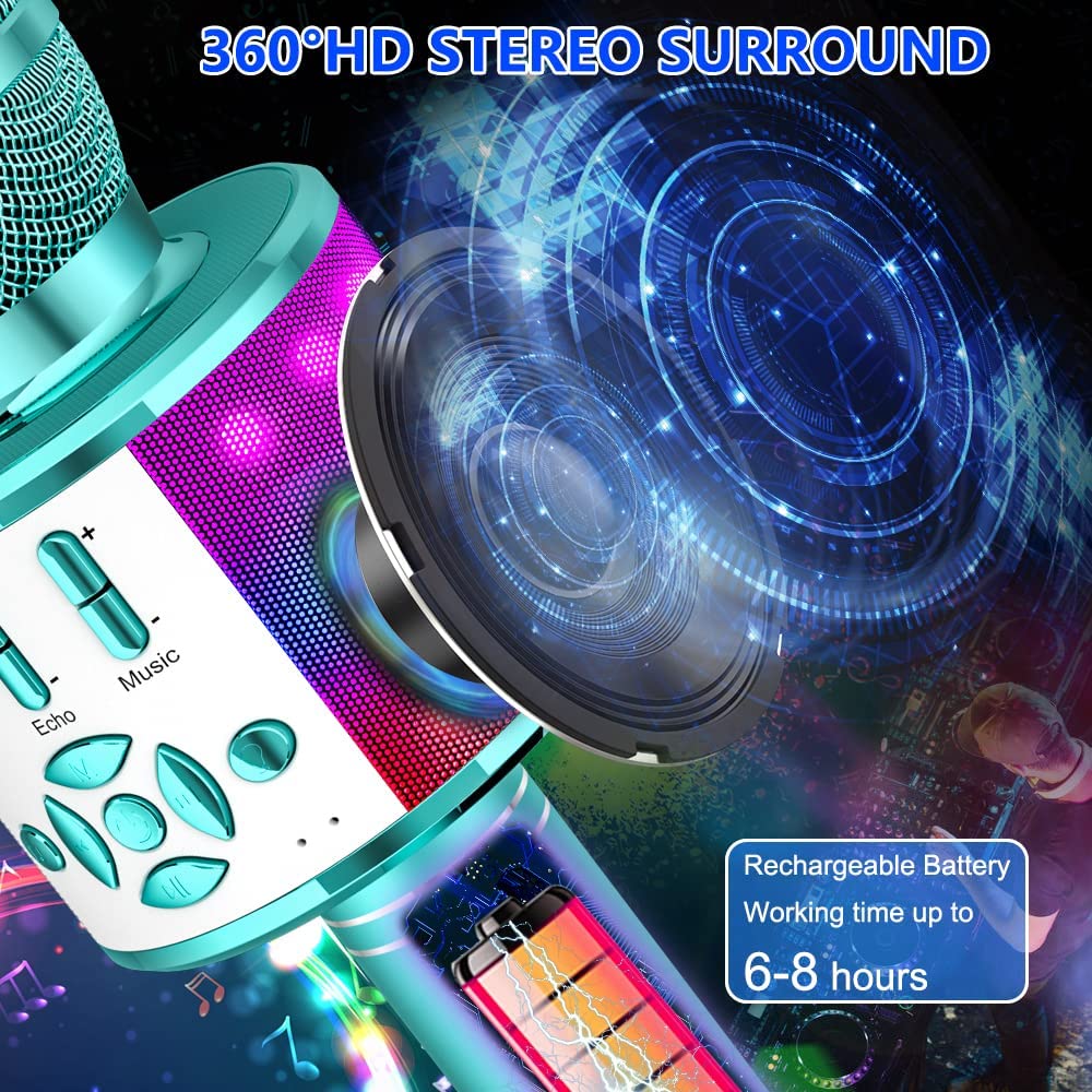 【Magic Sound + Multi-Colored LED Lights】Advanced 3-layers noise reduction technology will ensure high-quality, crystal-clear sound. Stunning KTV live-sound, and clear music rhythm with echo reverberation. With 4 magic sound modes to change your voice. And circled Multi-Colored LED Lights, LED Lights will dancing with your voice or music, makes party more happy.