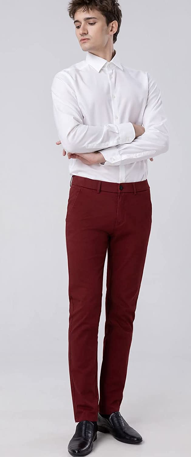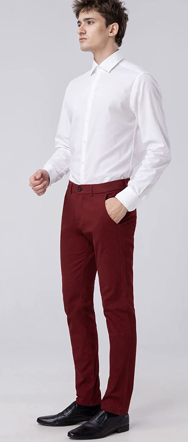 • Slim fit pants for men who want a more updated, slightly below the waist, slim through the thigh, tapered leg opening measures 6.89" flat taken from size 32W. The men’s khakis pants provide a versatile base for smart-casual looks.