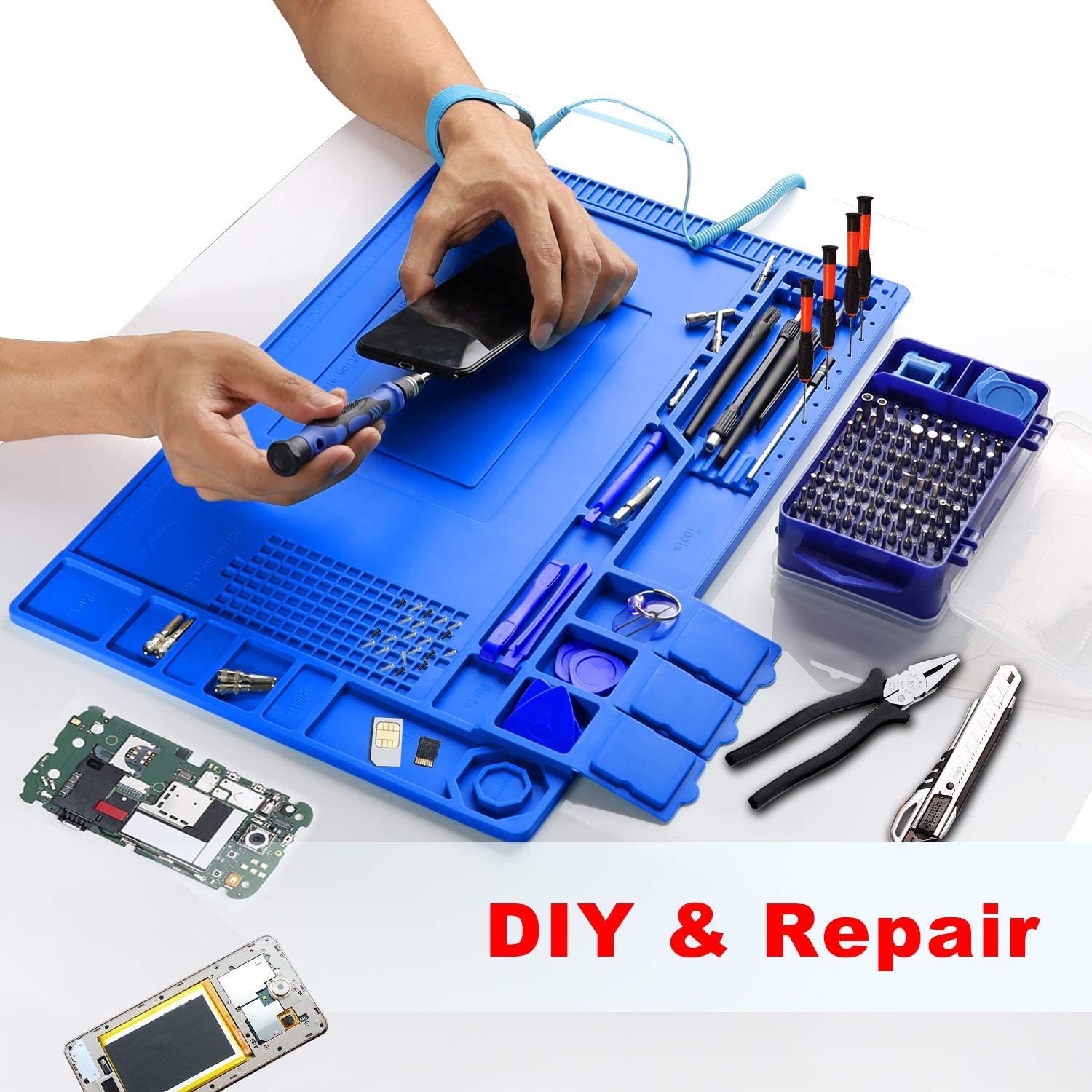 【Magnetic Anti Static Mat】The silicone heat-resistant mat can withstand high temperatures of 500°C(932°F), it is a necessary tool for electronics repair. This big ESD mat has a large enough working area, 17.8*11.8 Inches (45cm*30cm), and it has a clear functional zone, such as a magnetic zone, screw placement zone, parts store box, screwdriver zone, 36 cm scale ruler. You no longer have to worry about screw bits or small parts becoming messy or missing when you are doing DIY or repairing.