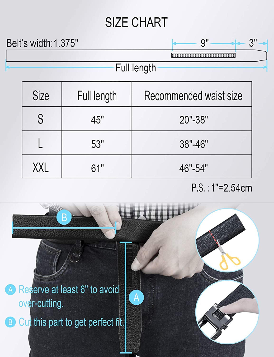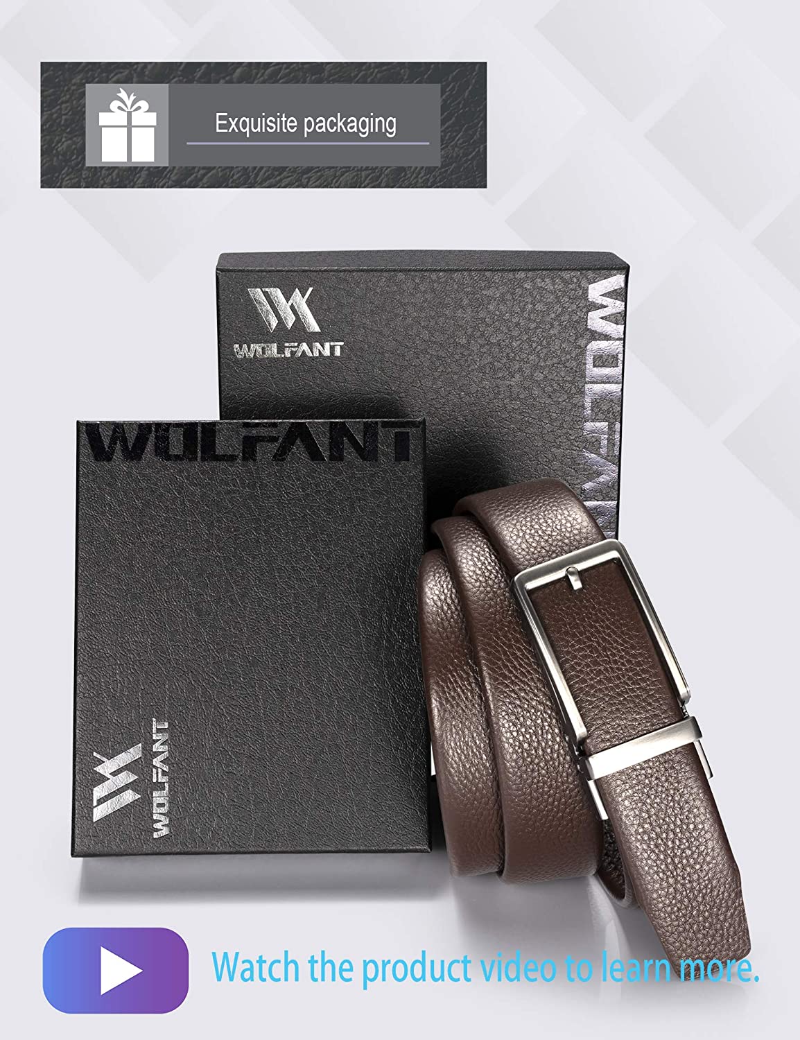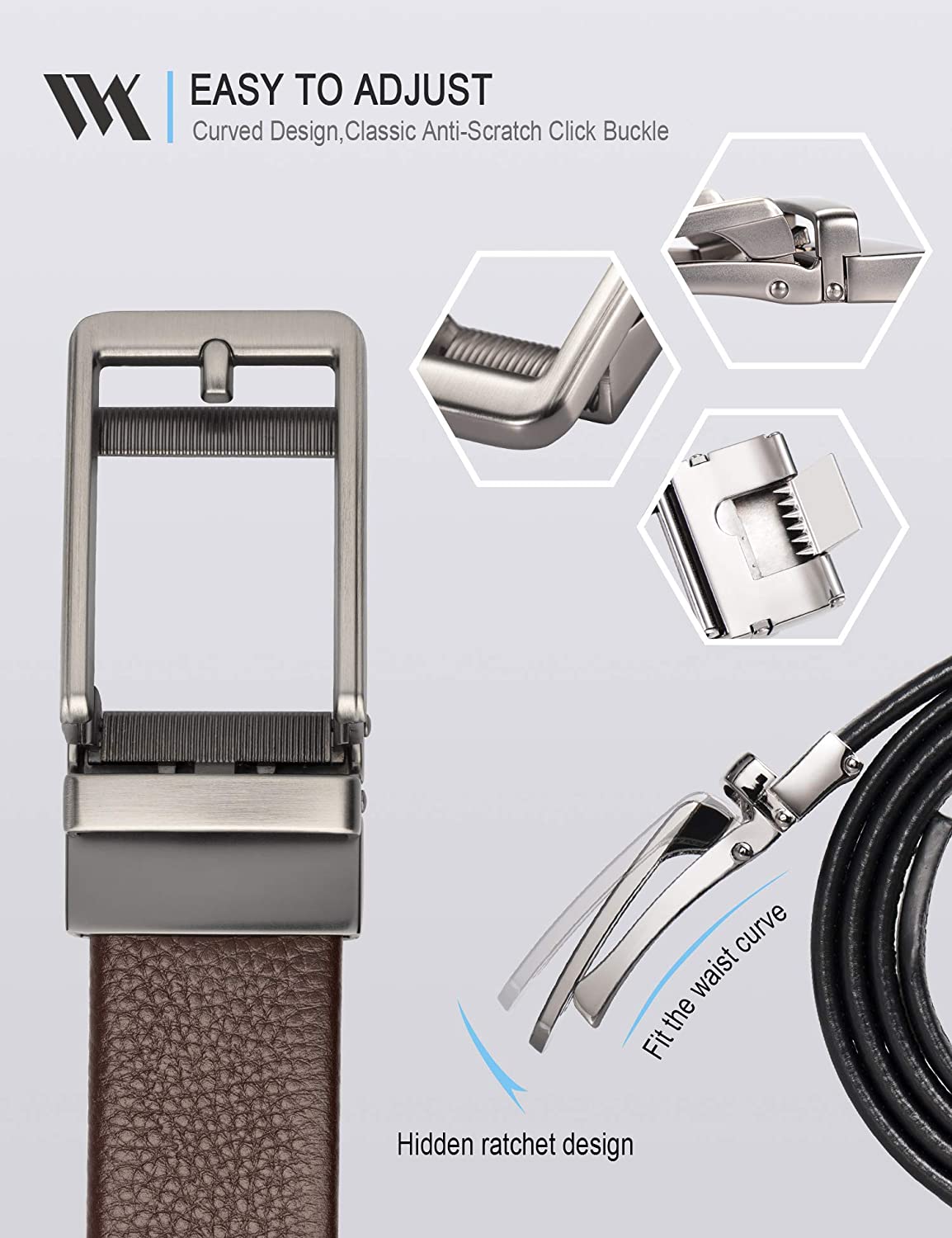 • [Exact Fit]: WOLFANT's No Holes Ratchet Dress Belt provides 38 micro adjustments for a superb Comfortable Fit. You can easily trim the belt to the ideal size so that you can control the length of the belt tail in order to get tailored appearance.