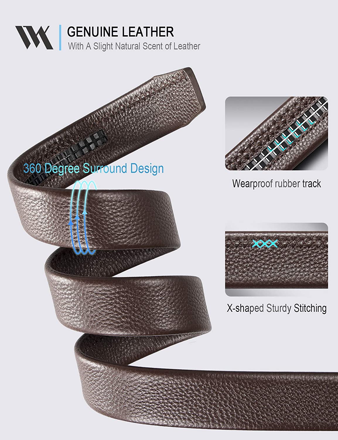 • [Genuine Leather]: The 360-Degree-Surround design makes that any part of leather you can touch is the epidermis of genuine leather with a warm texture. At the same time, the selected High Quality genuine leather only has a slight Natural Scent of leather, which is soft and firm, also avoids creases and cracks. It complemented with scratch resistant lightweight alloy buckle, provide you Maximum Durability beyond your expectation.