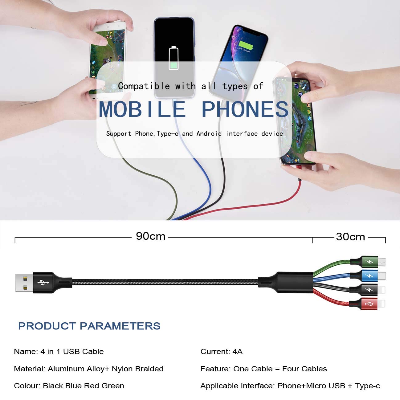 - 【Multi-Function】: 4 in 1 4A Nylon braided High Speed multi charging cord compatible with Phone 14 13 12 11 Pro Max / 14 13 12 11 Pro / 13 12 Mini / 14 Plus / 14 / 13 / 12 / 11 / SE / Xs Max / Xs / Xr / X / 8 Plus / 8 / 7 Plus / 7 / 6s Plus / 6s / 6 Plus / 6 / 5 / 5s , Pad Air / Pro, Pod / replacement Nano 7 / Samsung Galaxy S22+ / S22 / S21+ / S21 / S20+ / S20 / 210+ / S10 / S9+ / S9 / S8+ / S8 / Note 7 8 9 10 20, Huawei, HTC, LG, Sony, Google Pixel , Moto, PS 4/5 and other Android devices for most mobile phone charging.