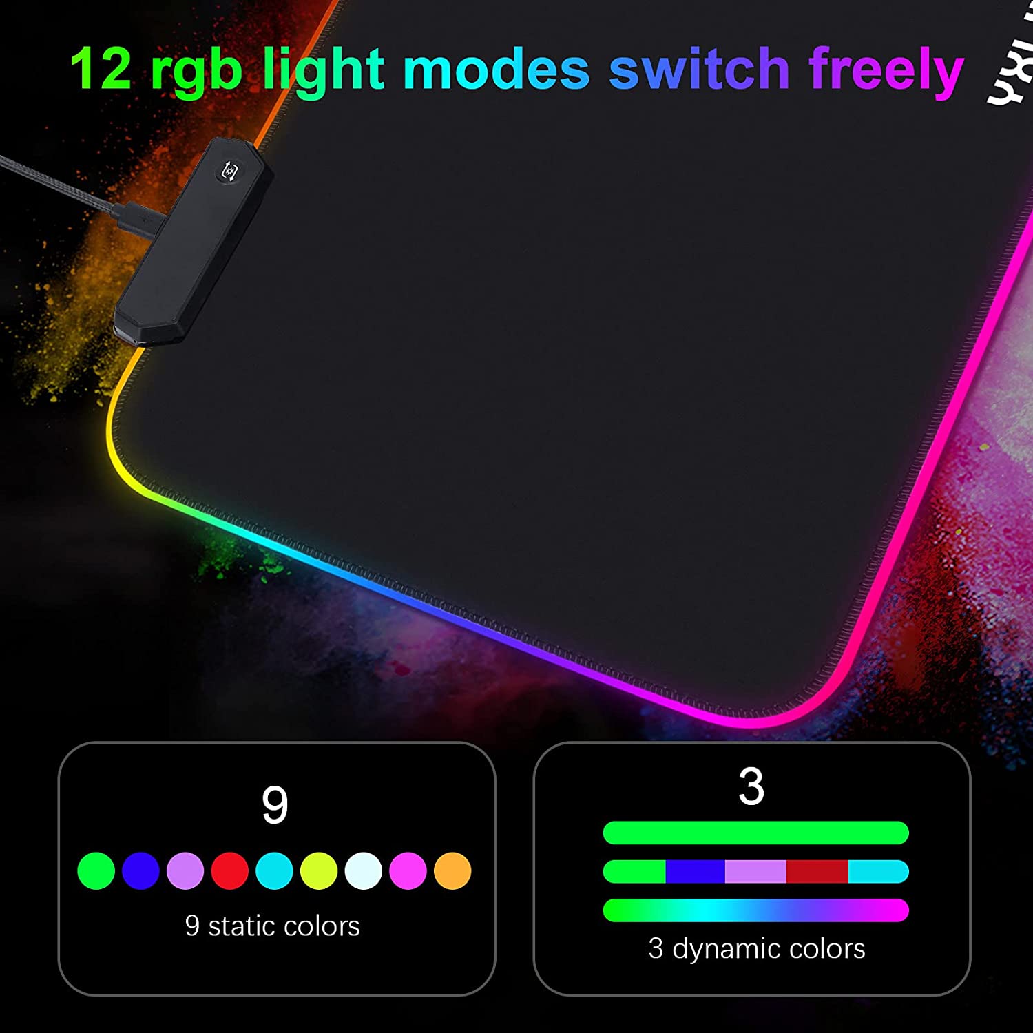 【 12 RGB Lighting Modes】 This extra-thick RGB gaming mouse pad features 9 static light modes and 3 dynamic modes.Just easily click the switch button to change colors, choose from 12 lighting modes, Breath, RGB flash, Neon Lighting, Green, Blue,Light Purple ,Red, Light Blue,Yellow,White,Purple,Orange.