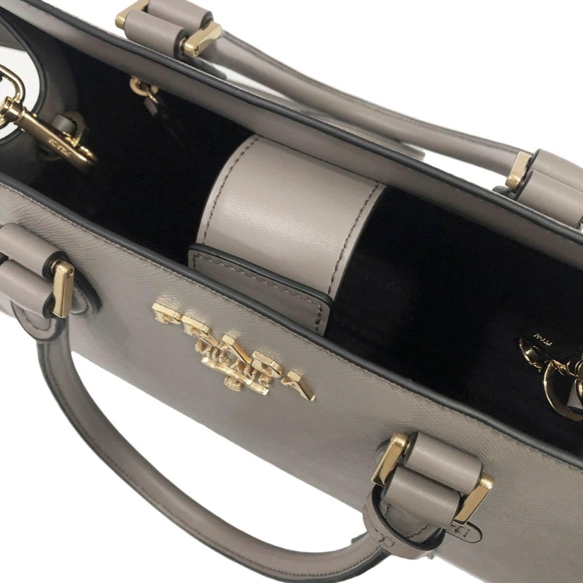 Color: Argilla gray. Saffiano Lux leather. Soft calf leather details. Gold-tone hardware. Prada Milano logo. Four protective metal purse feet. Detachable keyring clochette. Magnetic snap closure. Interior black jacquard fabric. Interior zipper pocket. Interior patch pocket.