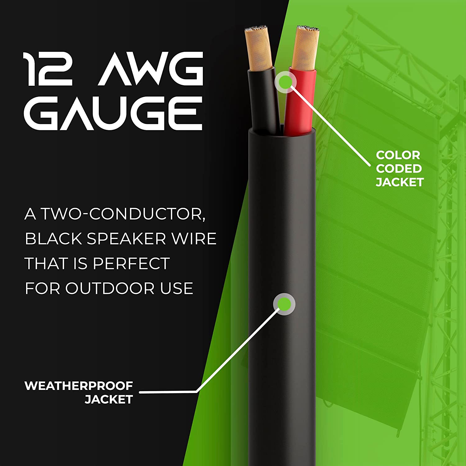 GearIT 12/2 Speaker Wire (100 Feet) 12 Gauge (Copper Clad Aluminum) - Outdoor Direct Burial in Ground/in Wall / CL3 CL2 Rated / 2 Conductors - CCA, Black 100ft