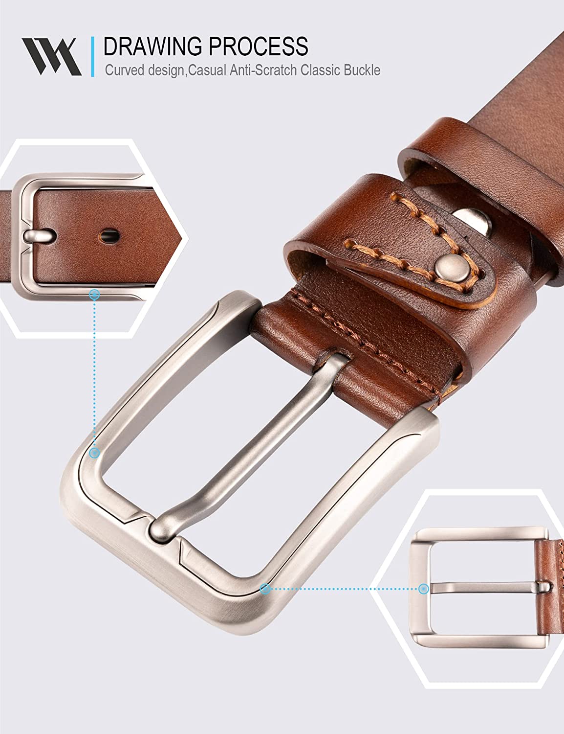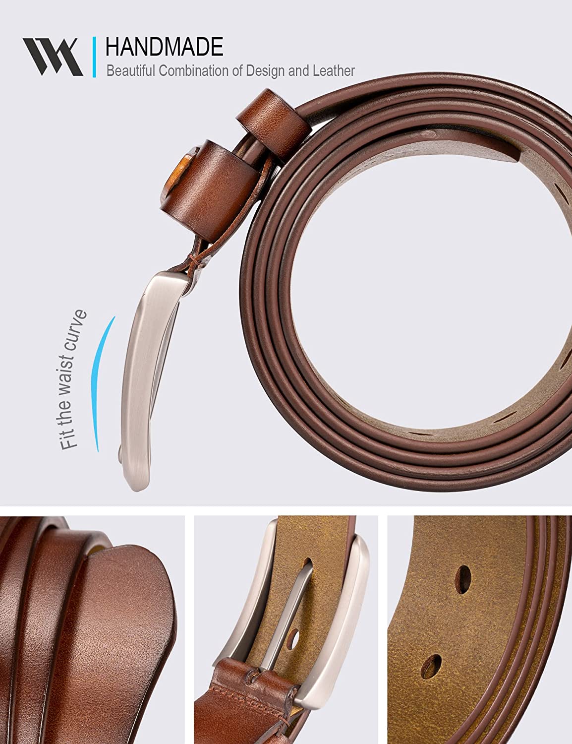 • [Ergonomic Buckle]: Unlike a flat buckle, the curve of heavy duty metal buckle makes it look more aesthetic. Combined with Exquisite handmade, this cowhide belt will serve as a fine accessory to any jeans,casual,work pants& more.