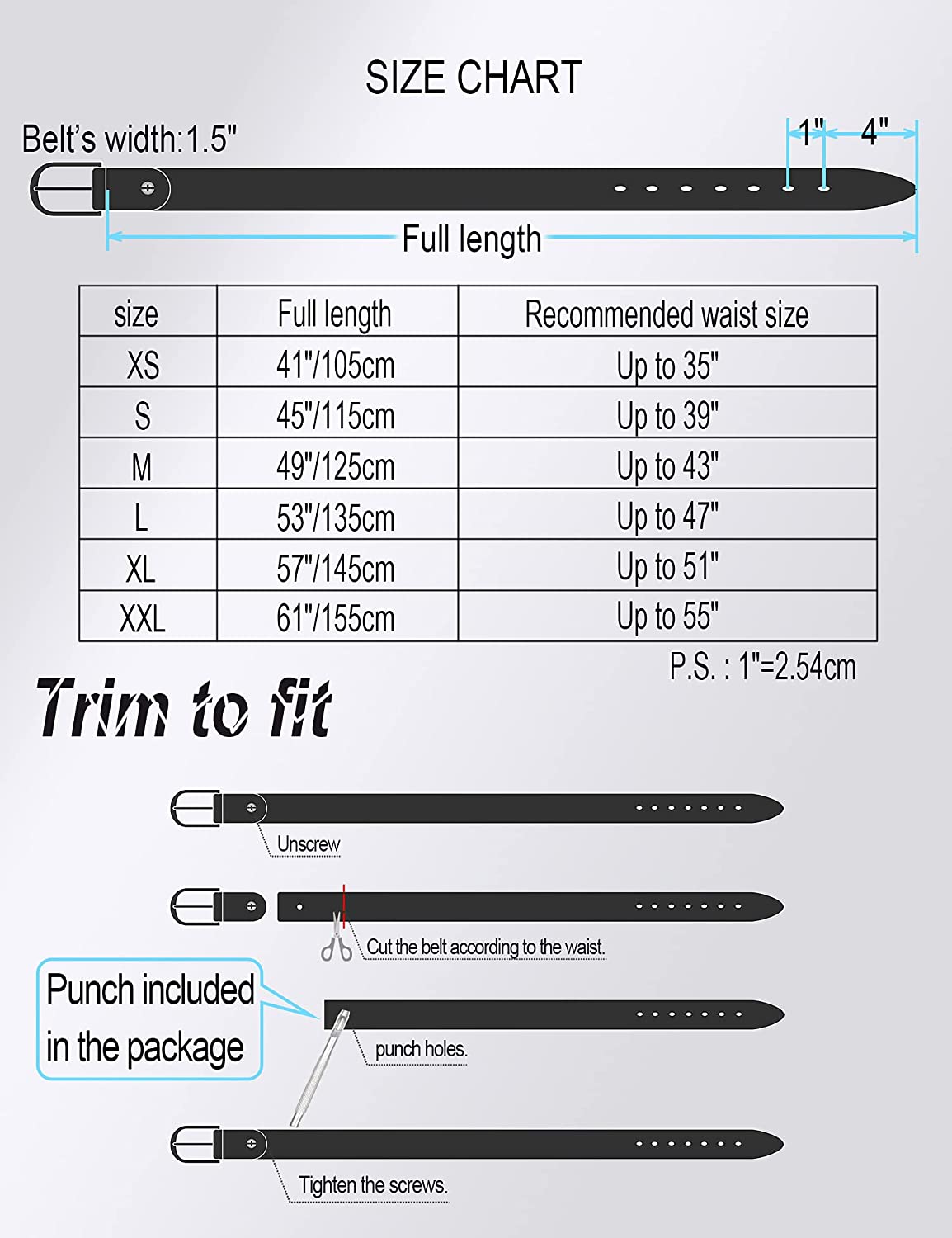• [Perfect Fit]: There are 7 holes on the mens belt to make belt fits more waistline size. Each product comes with a puncher so that you can remove the belt head to adjust the belt length according to your waist size.